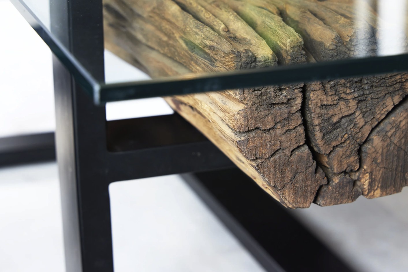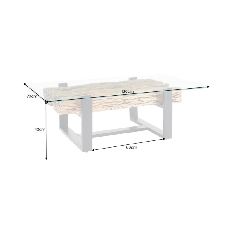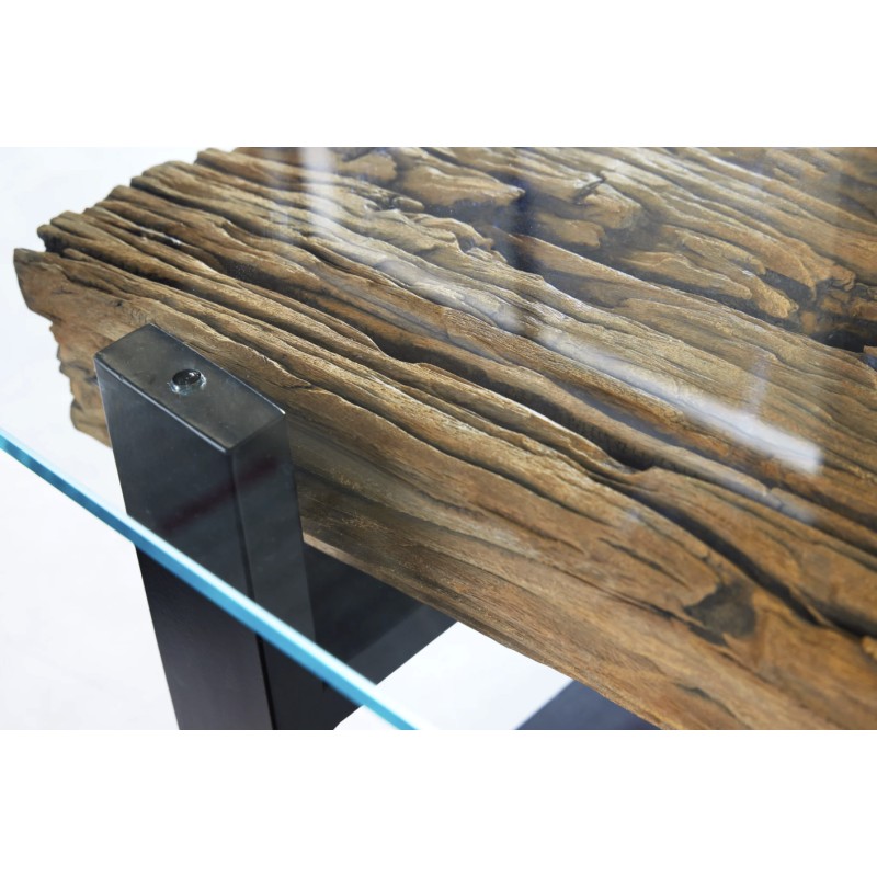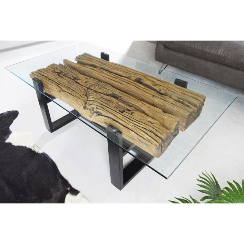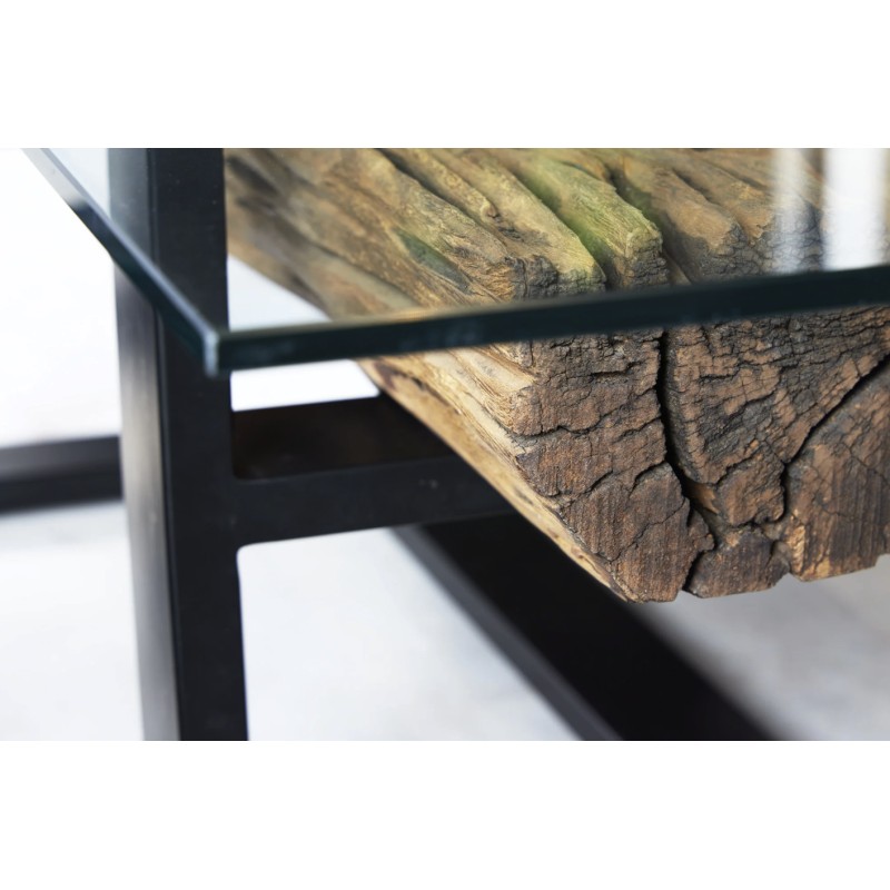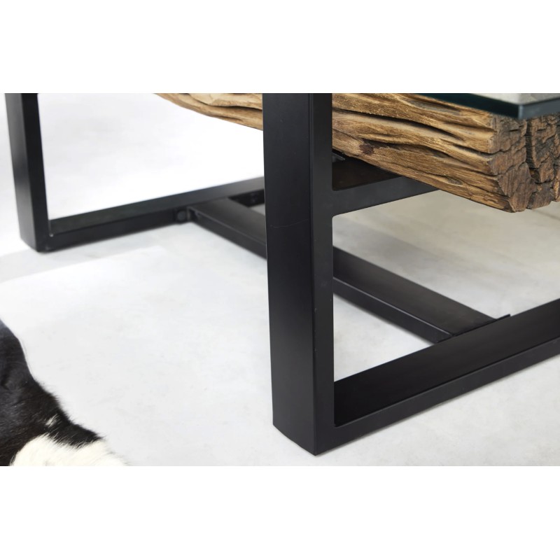 Le plateau supérieur en verre trempé de 10 mm d’épaisseur repose délicatement sur une base en bois, créant un contraste visuel saisissant. Cette transparence met en valeur le sous plateau en teck recyclé, révélant ses reliefs, ses irrégularités et son aspect brut pour un rendu authentique et chaleureux.