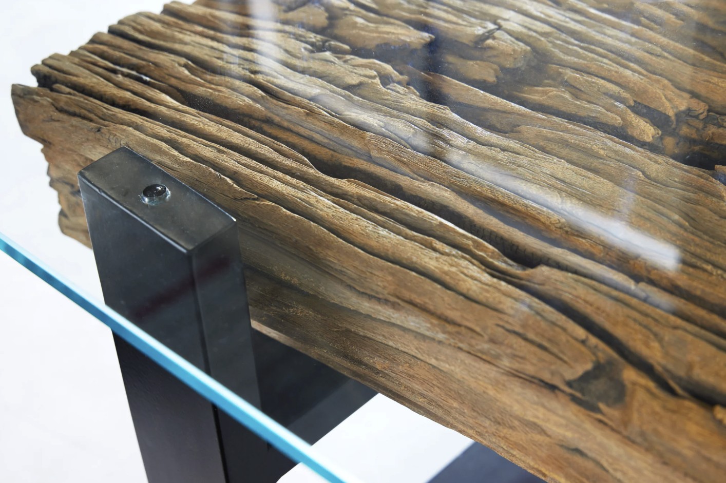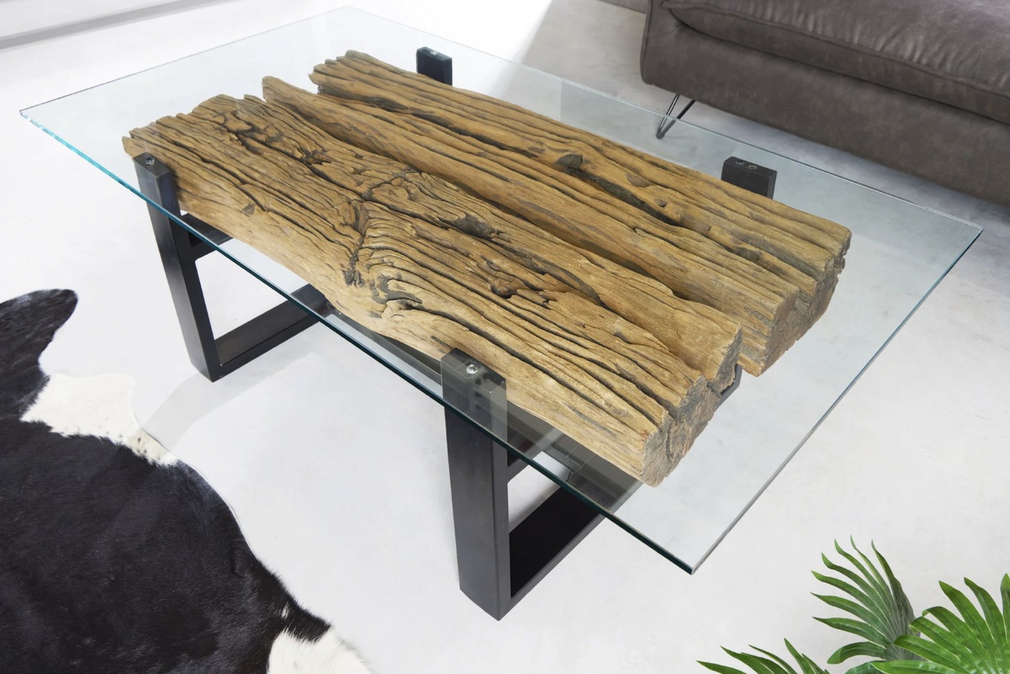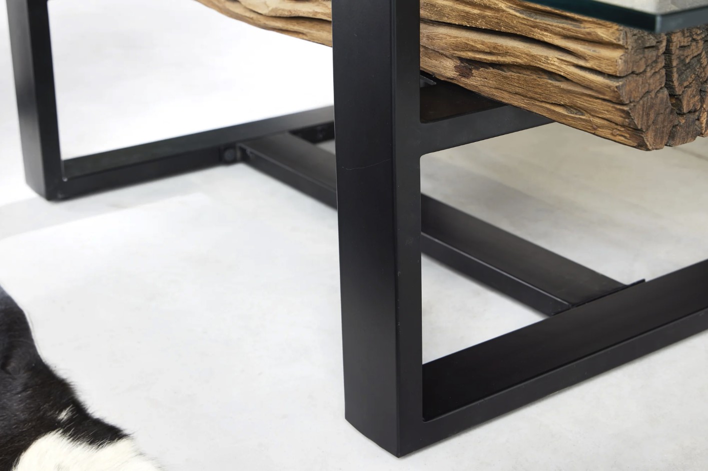 Le plateau supérieur en verre trempé de 10 mm d’épaisseur repose délicatement sur une base en bois, créant un contraste visuel saisissant. Cette transparence met en valeur le sous plateau en teck recyclé, révélant ses reliefs, ses irrégularités et son aspect brut pour un rendu authentique et chaleureux.
