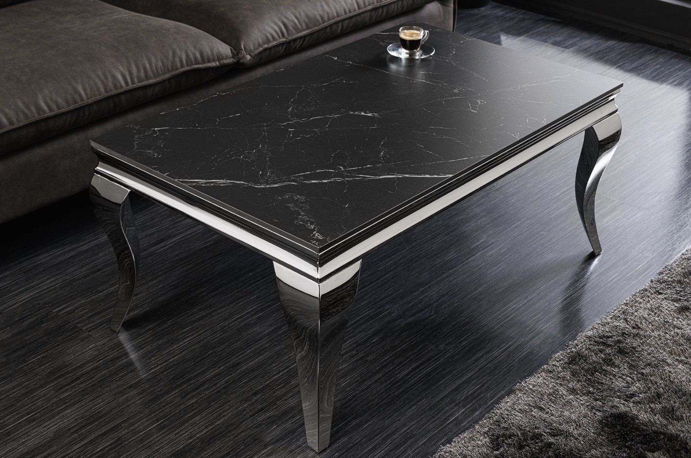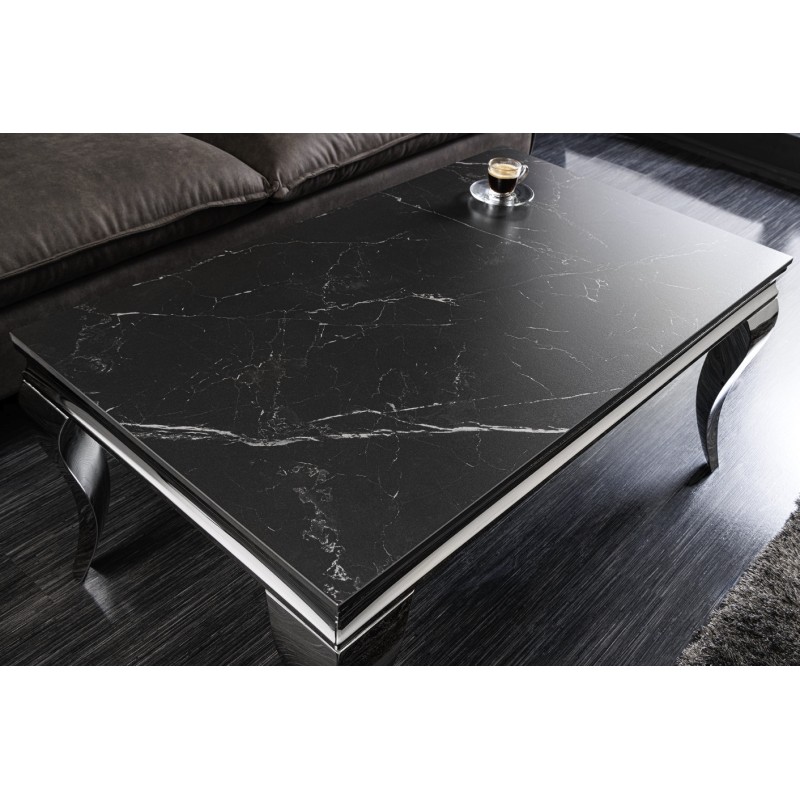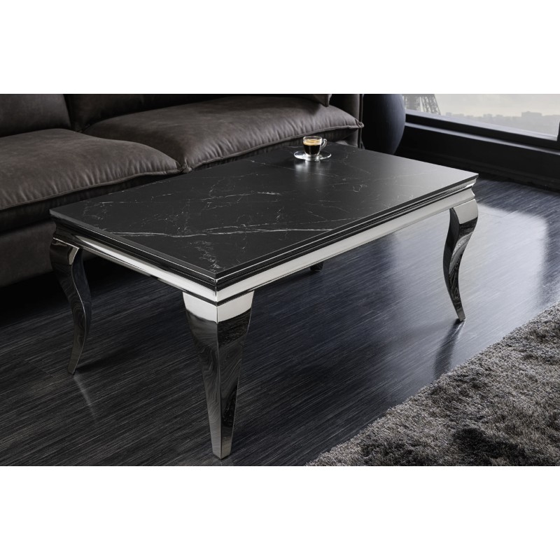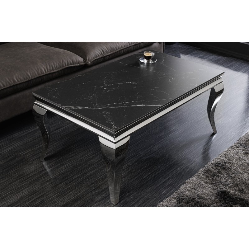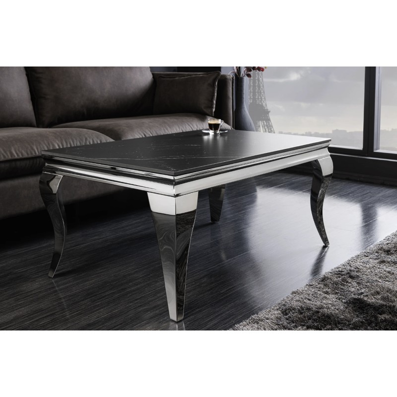 La table basse VELENA séduit immédiatement par son design raffiné associant une structure argentée brillante à un plateau effet marbre noir. Son esthétique baroque revisitée apporte une touche de caractère et d’élégance à votre salon.