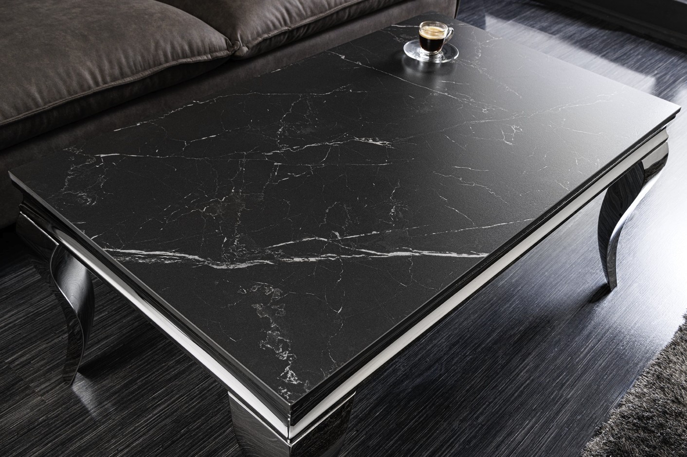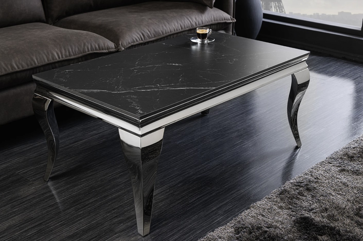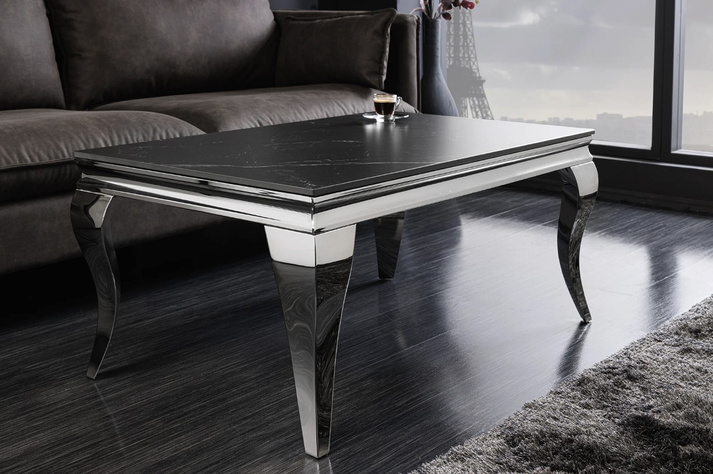 La table basse VELENA séduit immédiatement par son design raffiné associant une structure argentée brillante à un plateau effet marbre noir. Son esthétique baroque revisitée apporte une touche de caractère et d’élégance à votre salon.