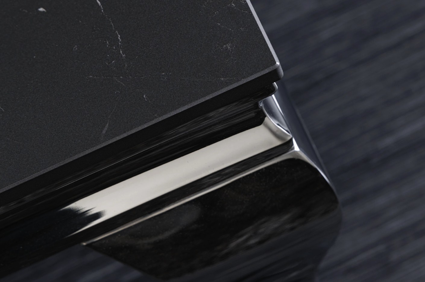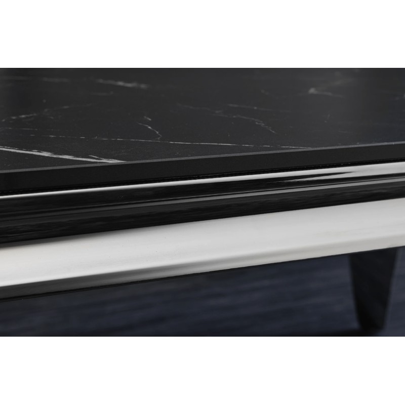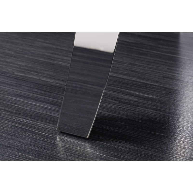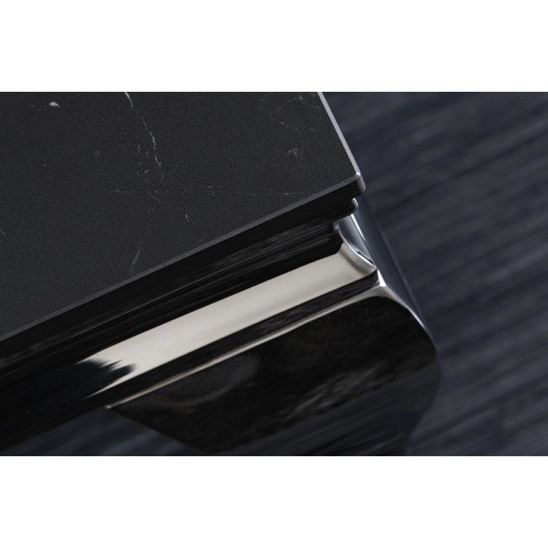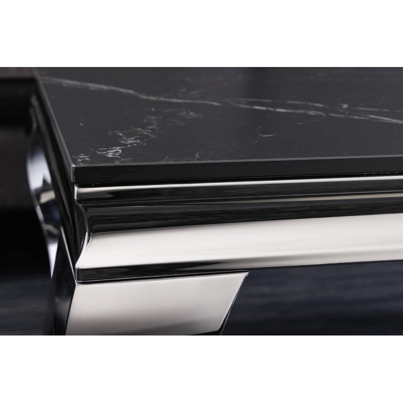 Sa structure en acier inoxydable finition miroir reflète la lumière et met en valeur l’ensemble du meuble. Le contraste entre le noir du plateau et l’éclat de l’argenté crée un effet visuel moderne et luxueux.