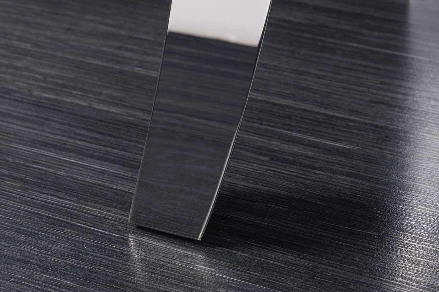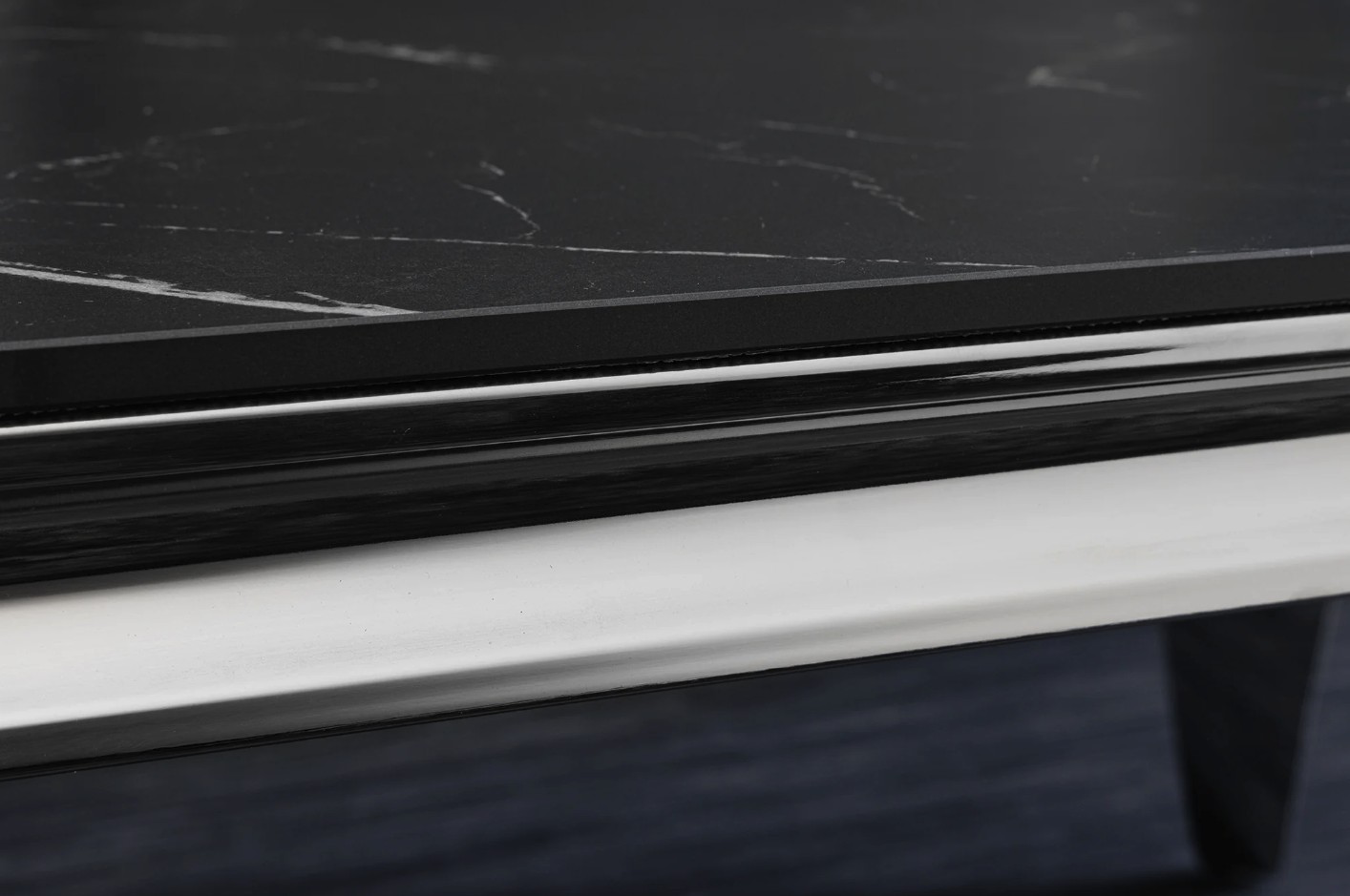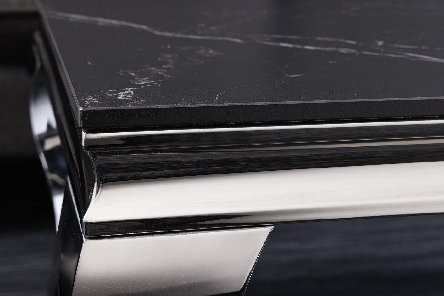 Sa structure en acier inoxydable finition miroir reflète la lumière et met en valeur l’ensemble du meuble. Le contraste entre le noir du plateau et l’éclat de l’argenté crée un effet visuel moderne et luxueux.