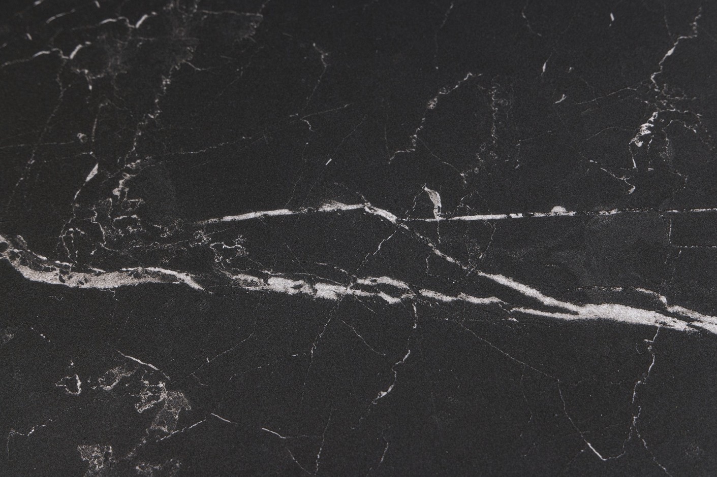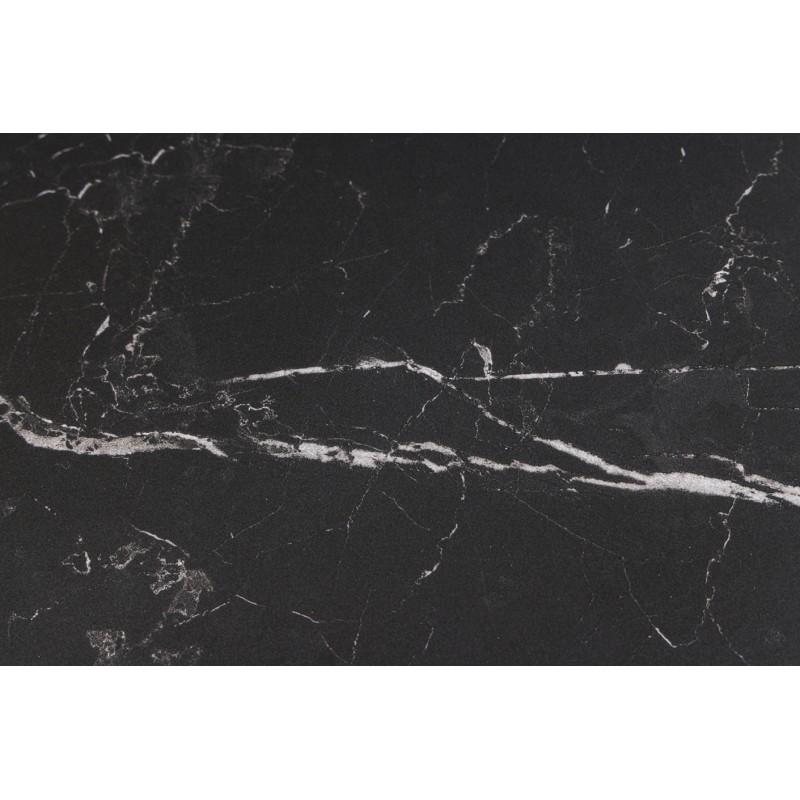 Le plateau rectangulaire en pierre frittée offre un rendu visuel haut de gamme avec ses veines blanches contrastant sur un fond noir profond. Résistant et durable, il combine esthétique et performance pour un usage quotidien.