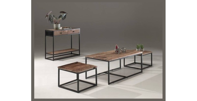 La table basse HELLINGTON est composée de 3 tables de style industriel dans des formats différents. Les petites tables carrées ont une hauteur de 33 cm, une longueur de 54 cm et une largeur de 54 cm. La grande table mesure 40 cm de haut, 120 cm de long et 60 cm de large.