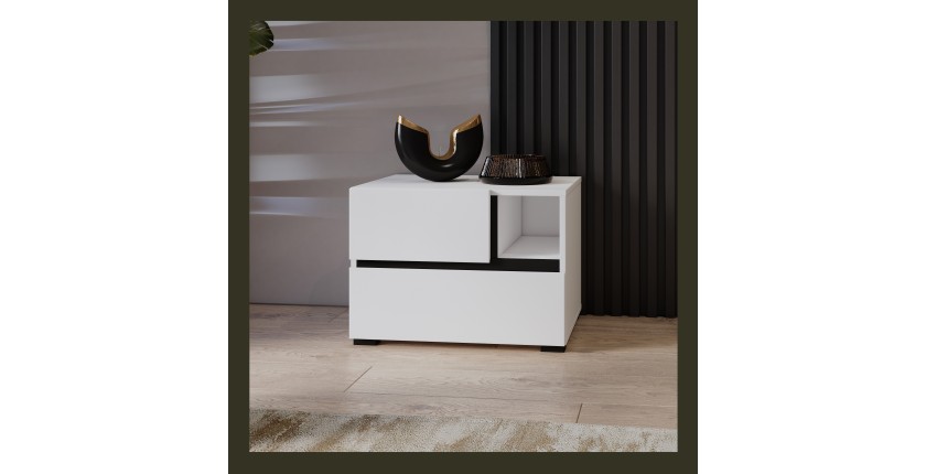 Compacte et design, cette table de nuit de 55 cm de large est parfaite pour les petits espaces comme les grandes chambres. Son revêtement blanc mat est subtilement contrasté par des détails noirs onyx, ajoutant du caractère à votre intérieur tout en restant sobre et moderne.