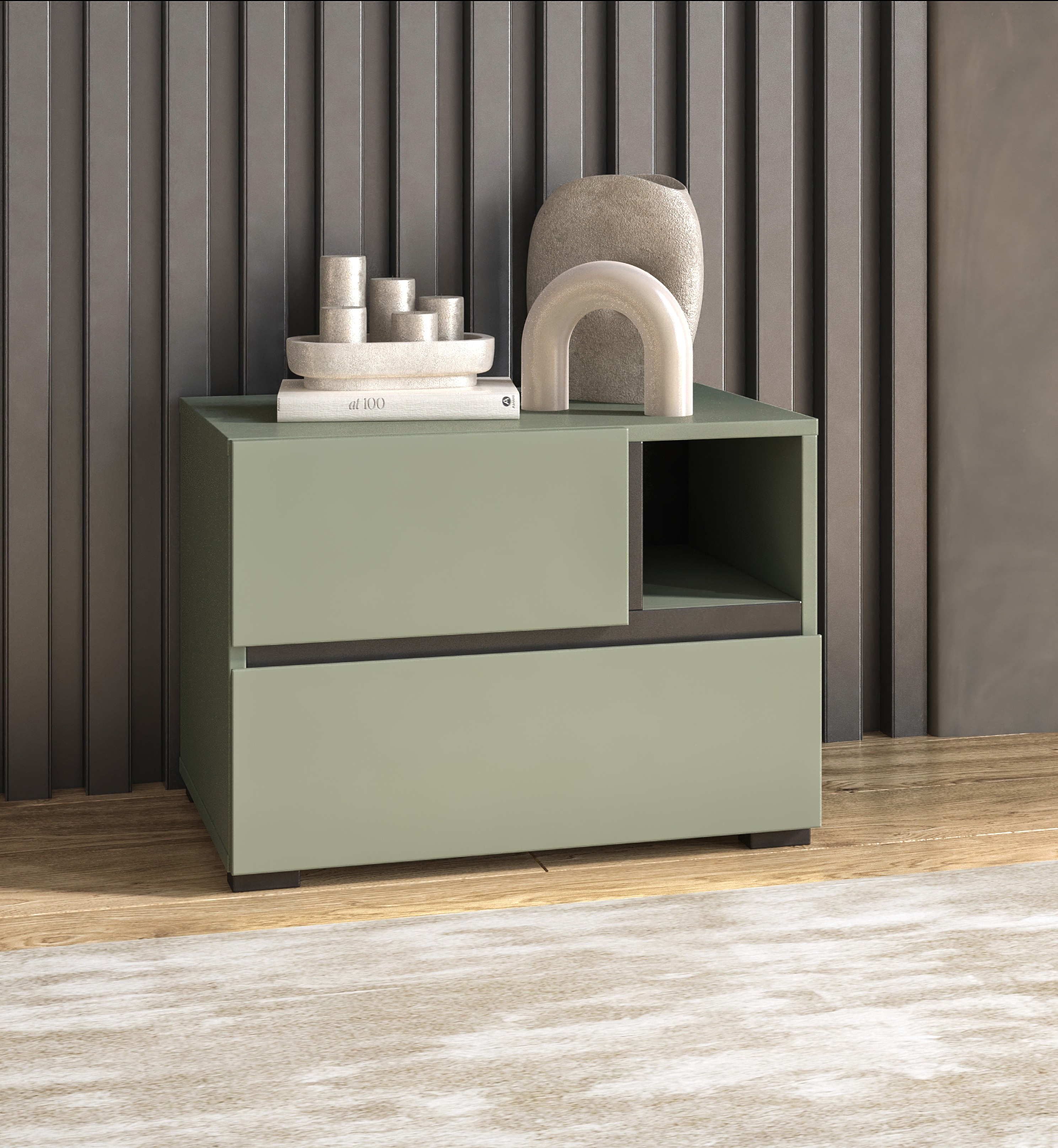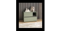 Avec ses 55 cm de large, cette table de nuit au format compact trouve sa place aussi bien dans une grande chambre que dans un espace plus réduit. Son coloris vert sauge doux est subtilement contrasté par des détails noirs mats, apportant une touche contemporaine tout en restant sobre.