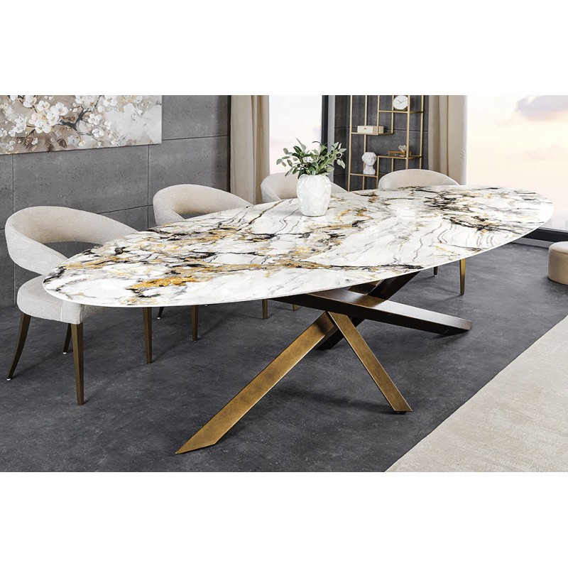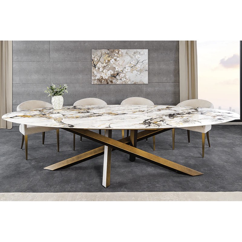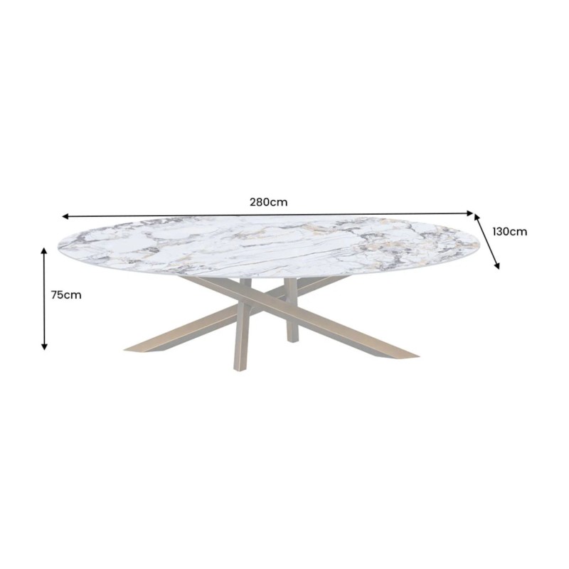 Offrez à votre intérieur une pièce maîtresse prestigieuse avec la table AERIS. Son plateau en céramique effet marbre blanc et bronze associé à des pieds en métal lui confère une allure raffinée et contemporaine. Grâce à sa longueur généreuse de 280 cm, elle permet de réunir jusqu’à 12 convives dans une ambiance conviviale et élégante.