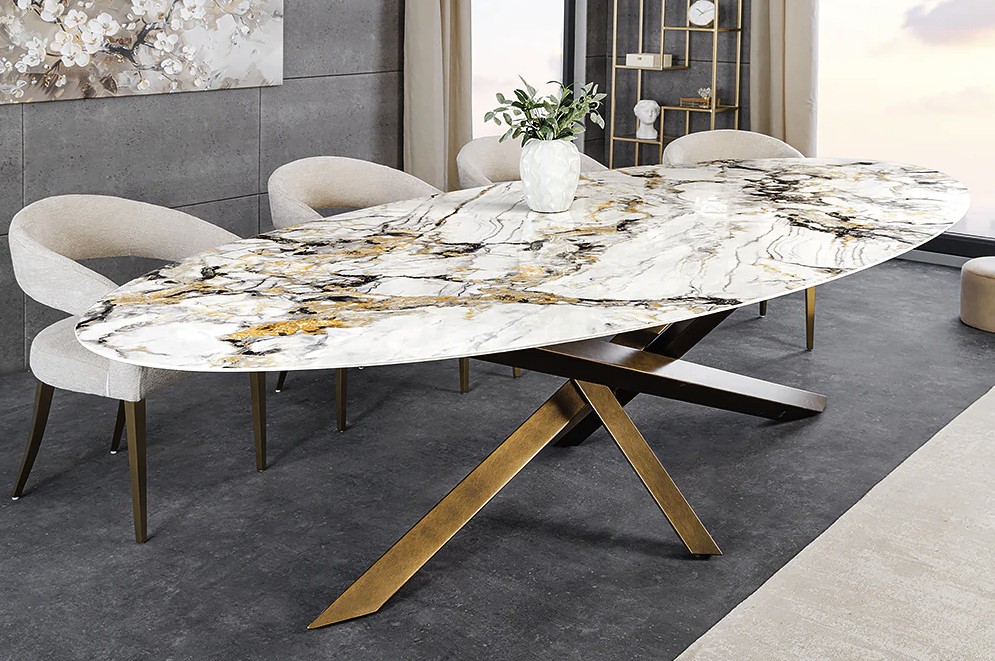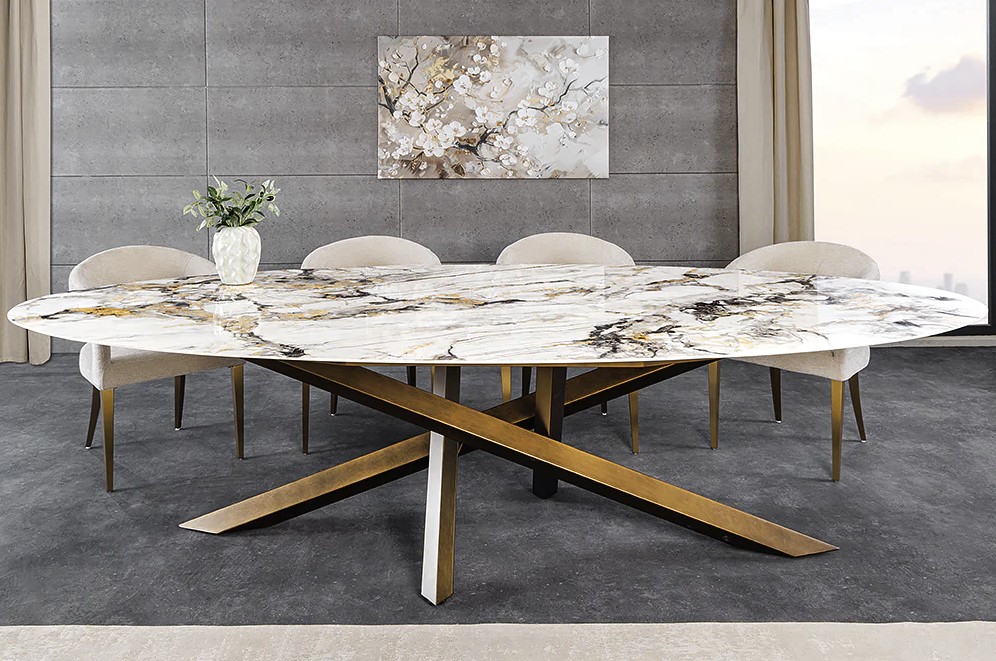 La table de salle à manger AERIS allie luxe et fonctionnalité. Son plateau en céramique effet marbre apporte élégance et durabilité, tandis que sa grande dimension en fait un choix idéal pour recevoir de nombreux invités dans un cadre chic et chaleureux.