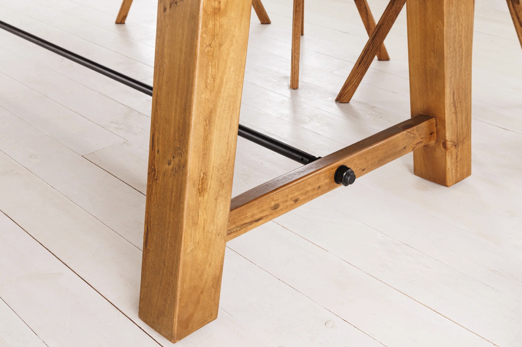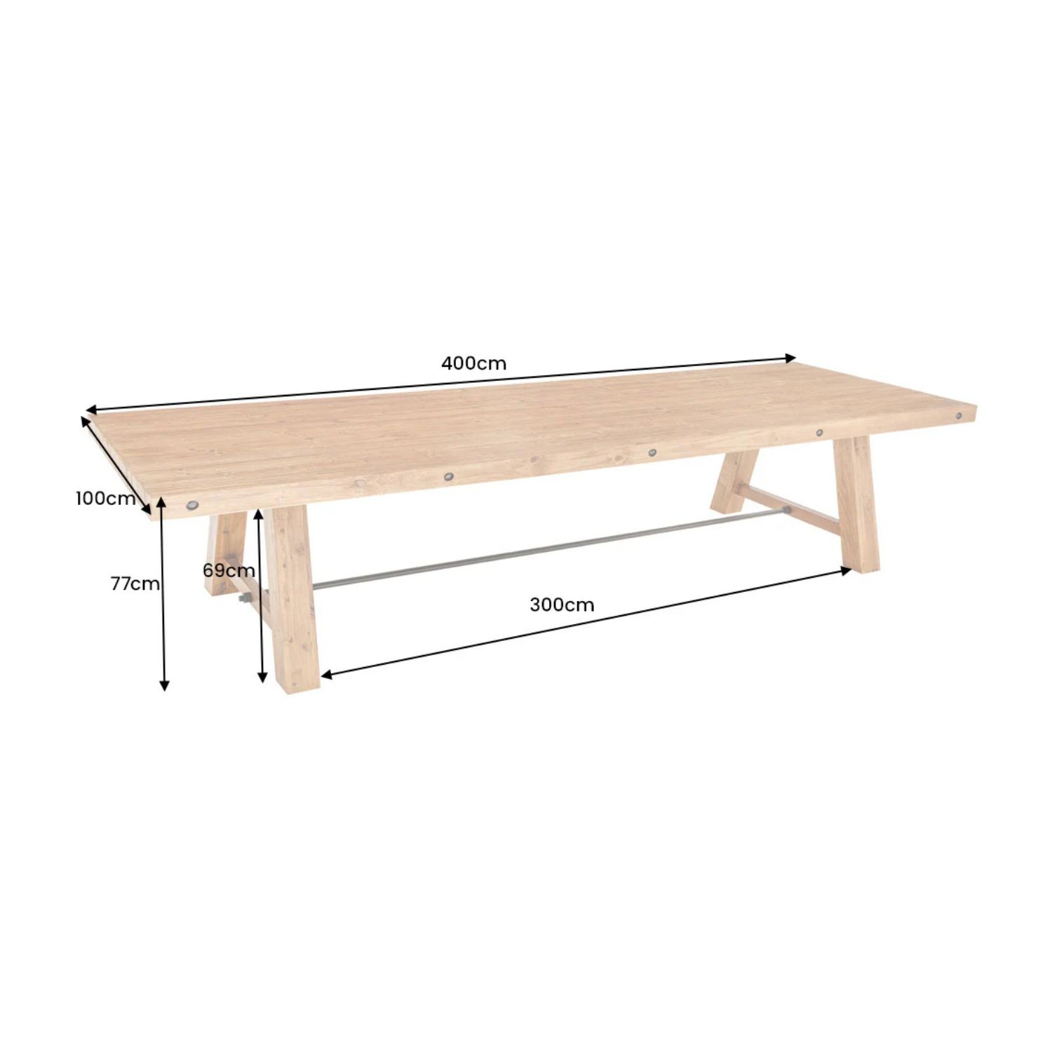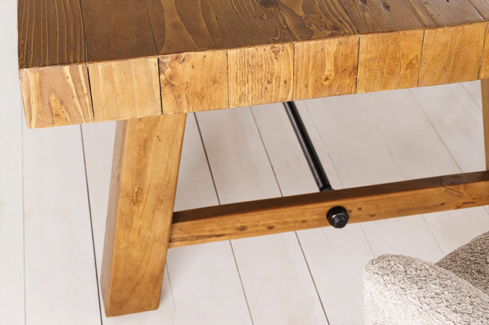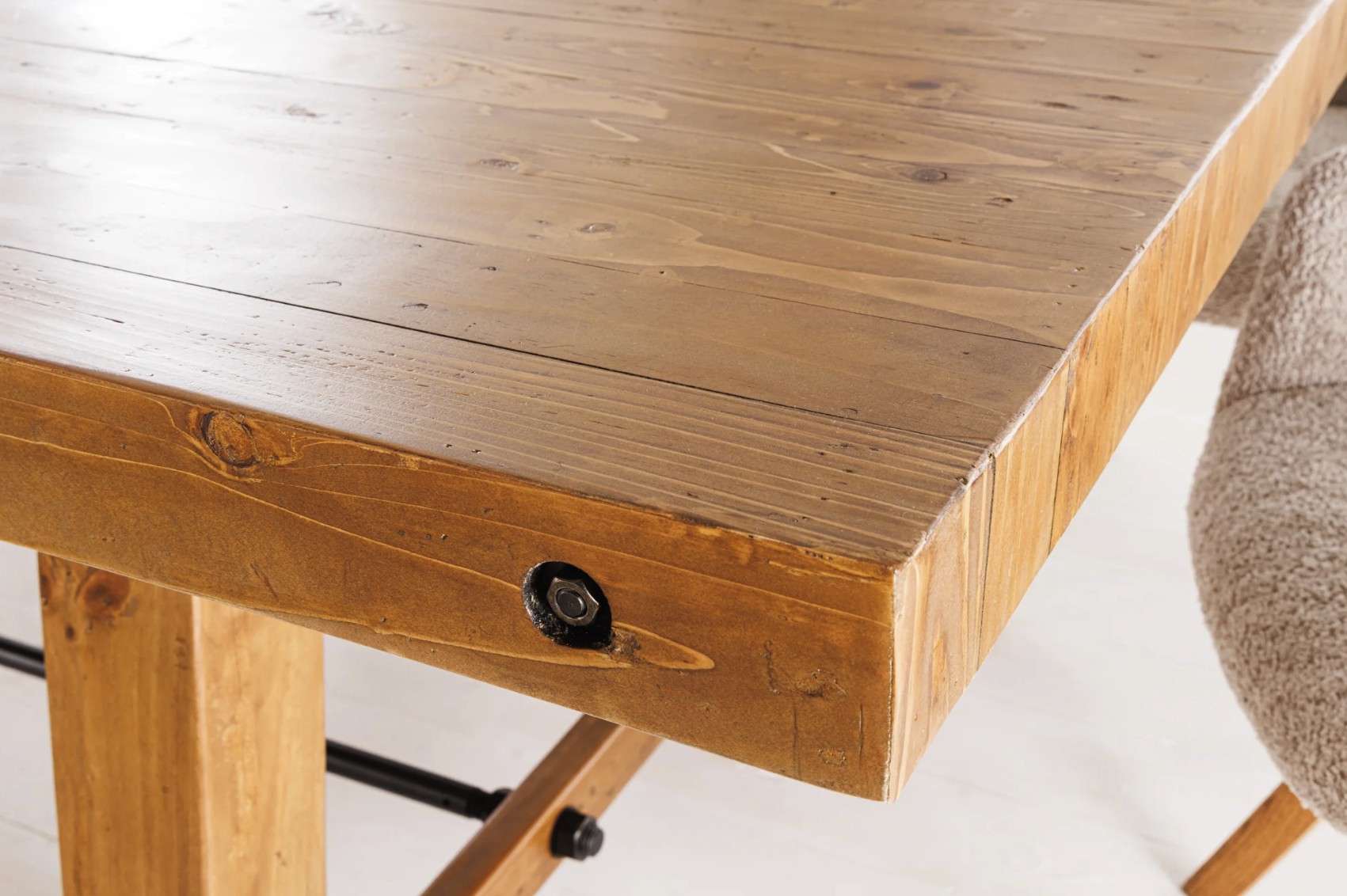Avec ses dimensions généreuses de 400 cm, la table de salle à manger RANCHO est idéale pour accueillir de grands repas conviviaux. Conçue en bois massif de pin recyclé verni et renforcée par une structure en métal noir, elle allie charme rustique, durabilité et robustesse.