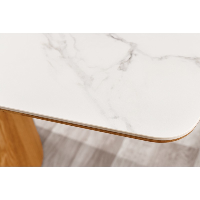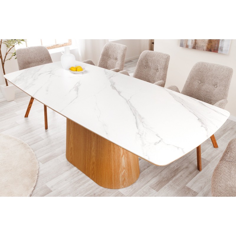 Invitez design et raffinement dans votre intérieur avec la table LUMEA. Son plateau en céramique effet marbre blanc repose sur une structure aspect bois clair, offrant à la fois modernité et chaleur. Avec ses 200 cm de longueur, elle est idéale pour accueillir confortablement de 8 à 10 convives.