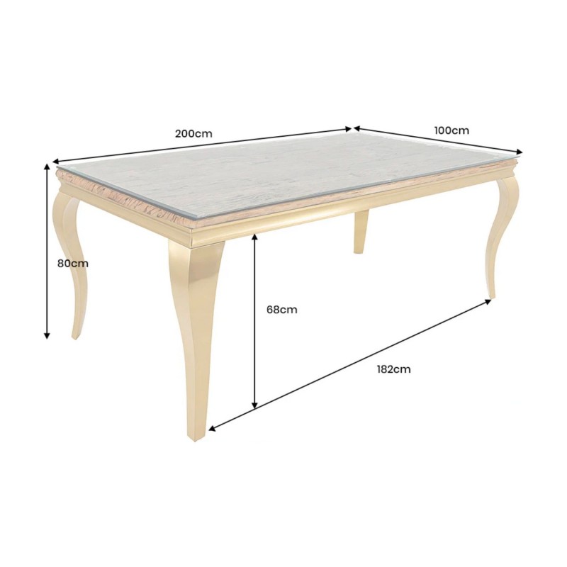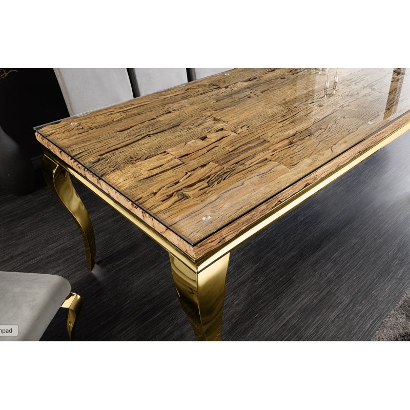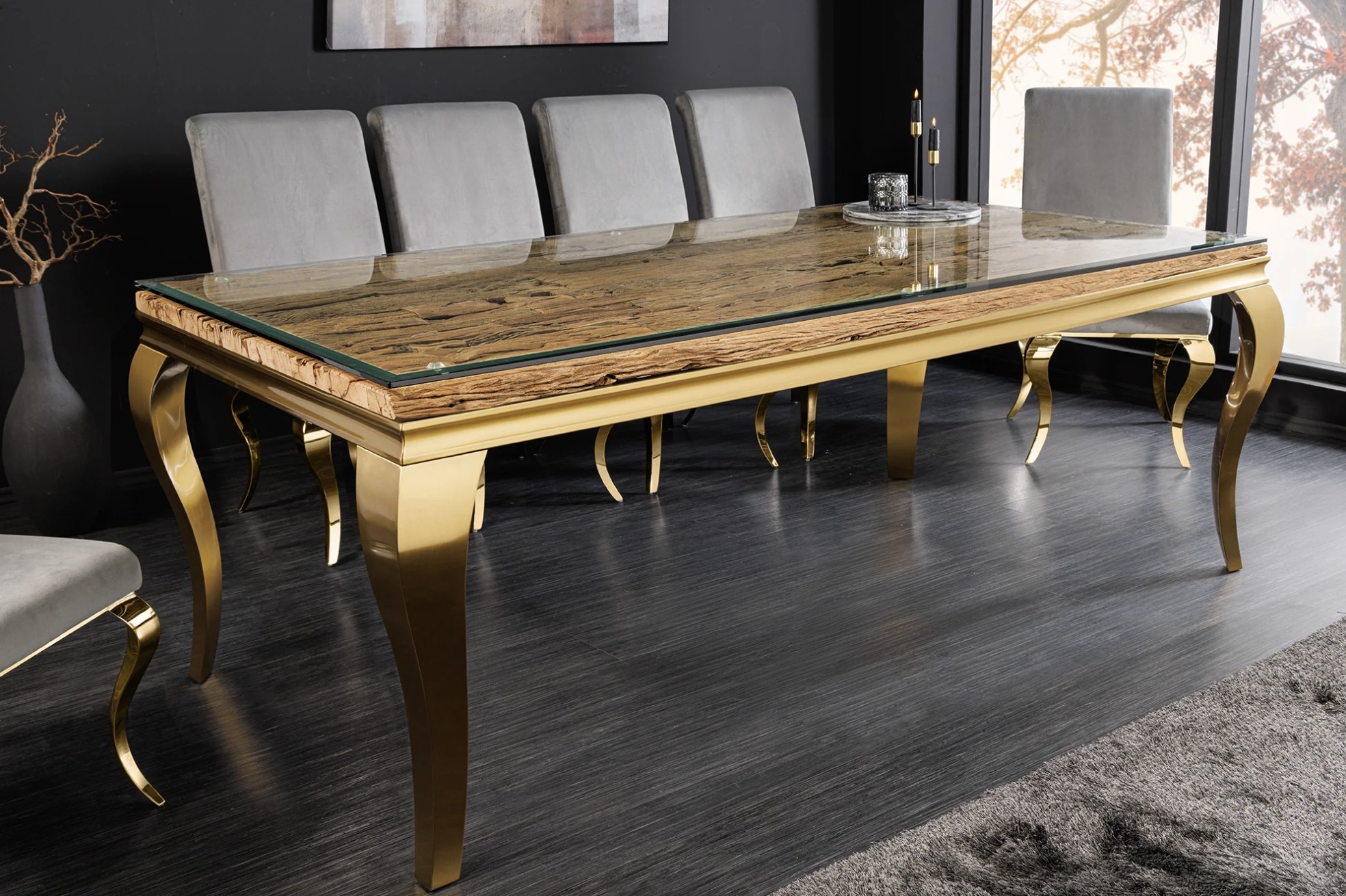 La table de salle à manger VELENA conjugue luxe et authenticité grâce à son plateau en bois de teck massif recouvert de verre trempé, soutenu par une structure en acier poli doré. Son style baroque chic en fait une pièce centrale et prestigieuse pour sublimer votre salle à manger. Cette table existe également dans une version avec plateau uniquement en verre trempé, pour un rendu plus minimaliste.