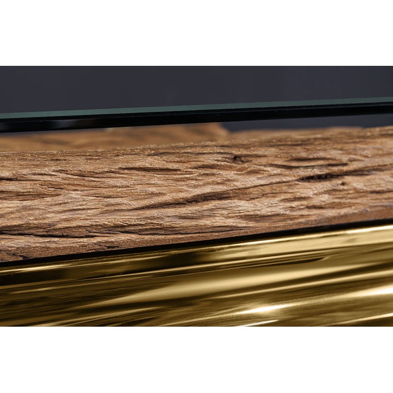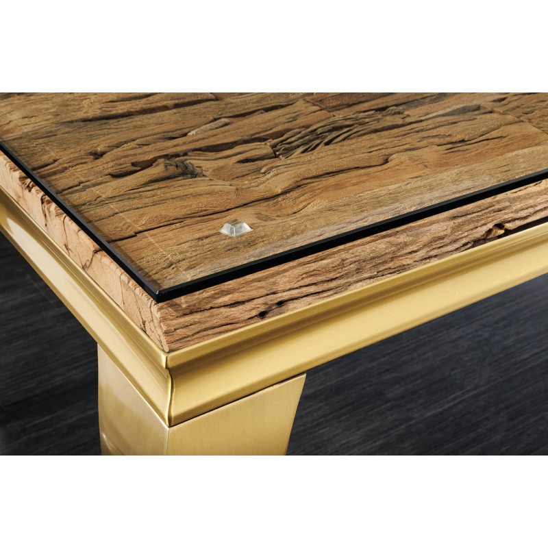 Avec ses 200 cm de longueur, la VELENA peut accueillir jusqu’à 10 convives. Le bois de teck lui confère chaleur et robustesse, tandis que le verre apporte luminosité et élégance. Sa structure dorée en acier inoxydable poli assure stabilité et raffinement. La surface de ce meuble attire immédiatement l'attention de tous ! Le bois massif non traité a été assemblé à partir de nombreux éléments en bois différents. Pour un look authentique, vous trouverez des morceaux de bois incrustés et une surface très individuelle et irrégulière sur chaque meuble de cette série. La couleur du bois peut également varier. Découvrez une pièce unique et magnifique, avec sa propre histoire !