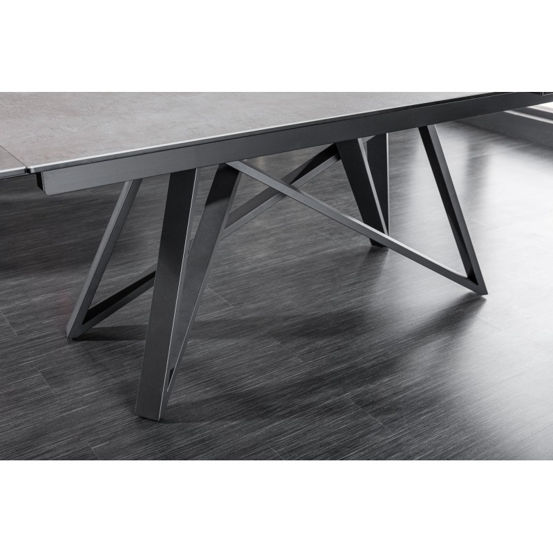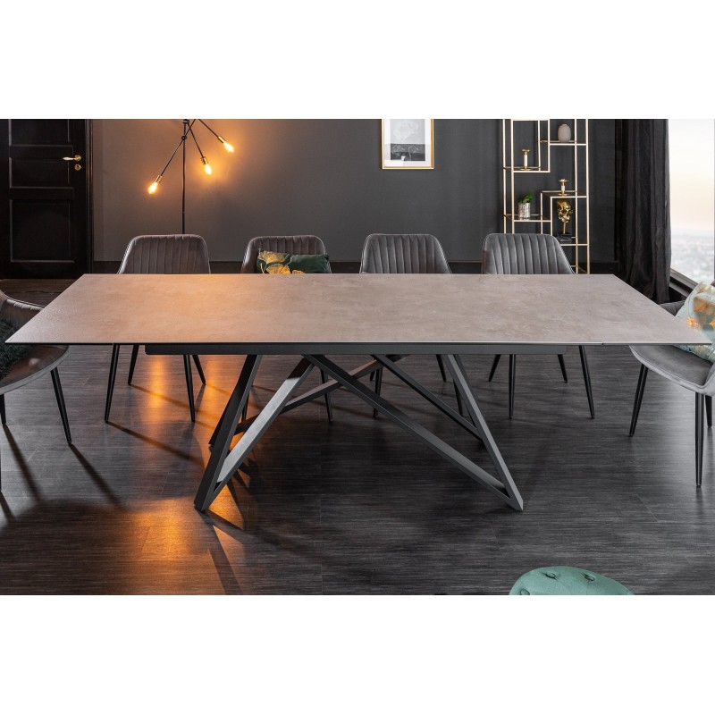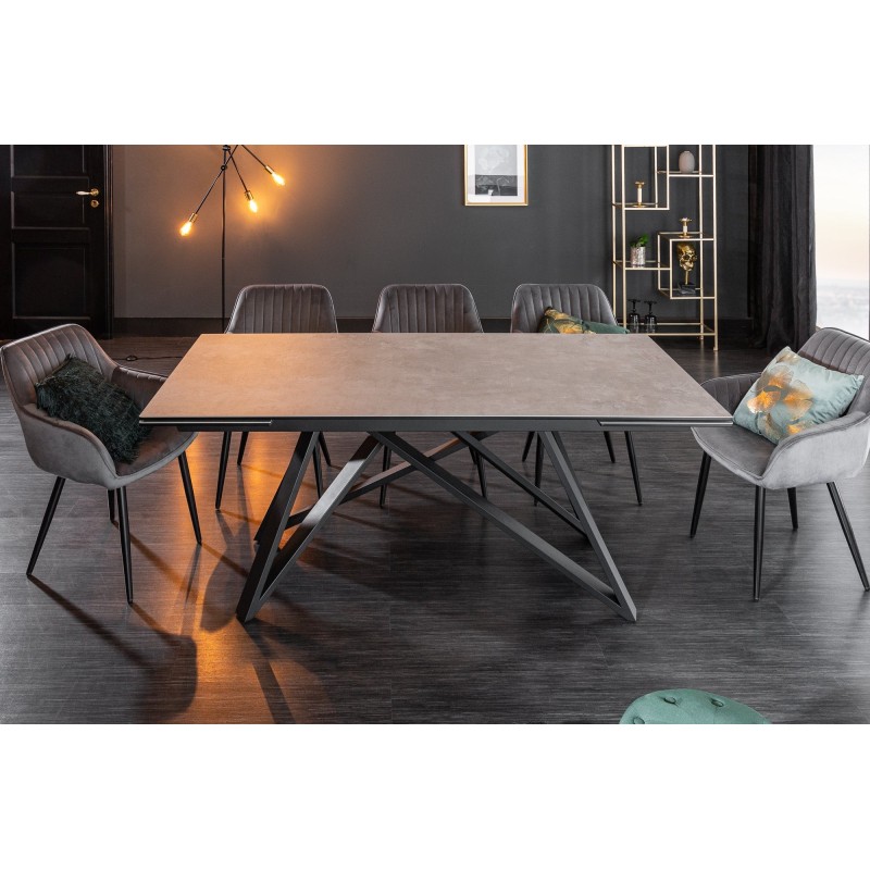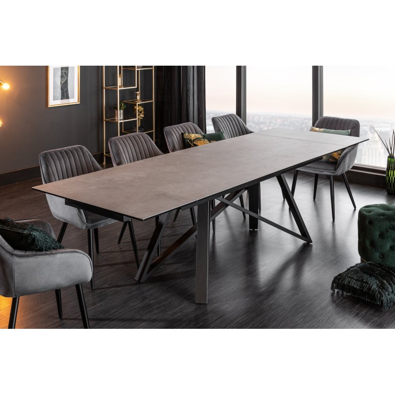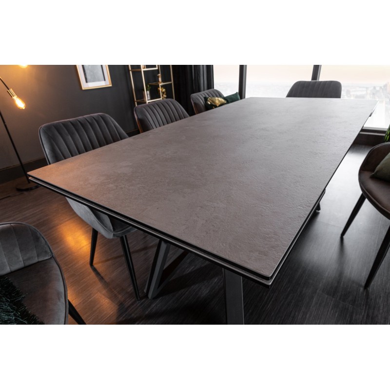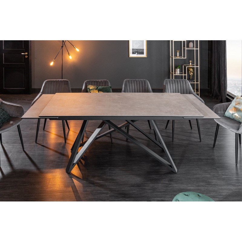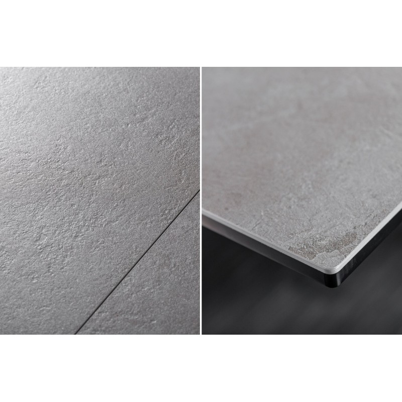 Alliez style moderne et praticité avec la table de salle à manger LIXOR. Son plateau en céramique effet ciment, renforcé par une base en verre trempé, lui confère un look urbain et raffiné. Grâce à sa structure métallique robuste et ses extensions dissimulées, elle s’adapte facilement à toutes les occasions.