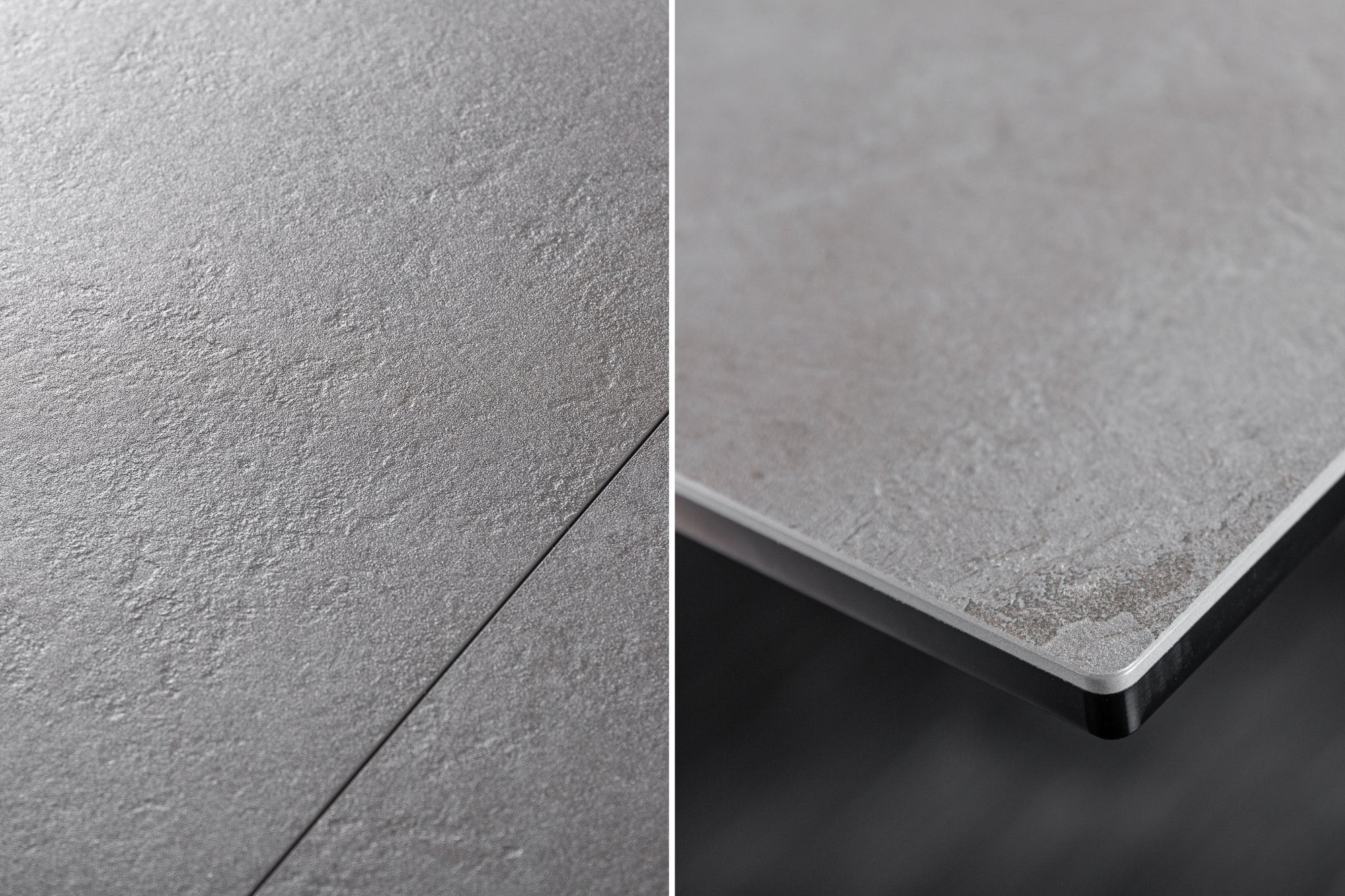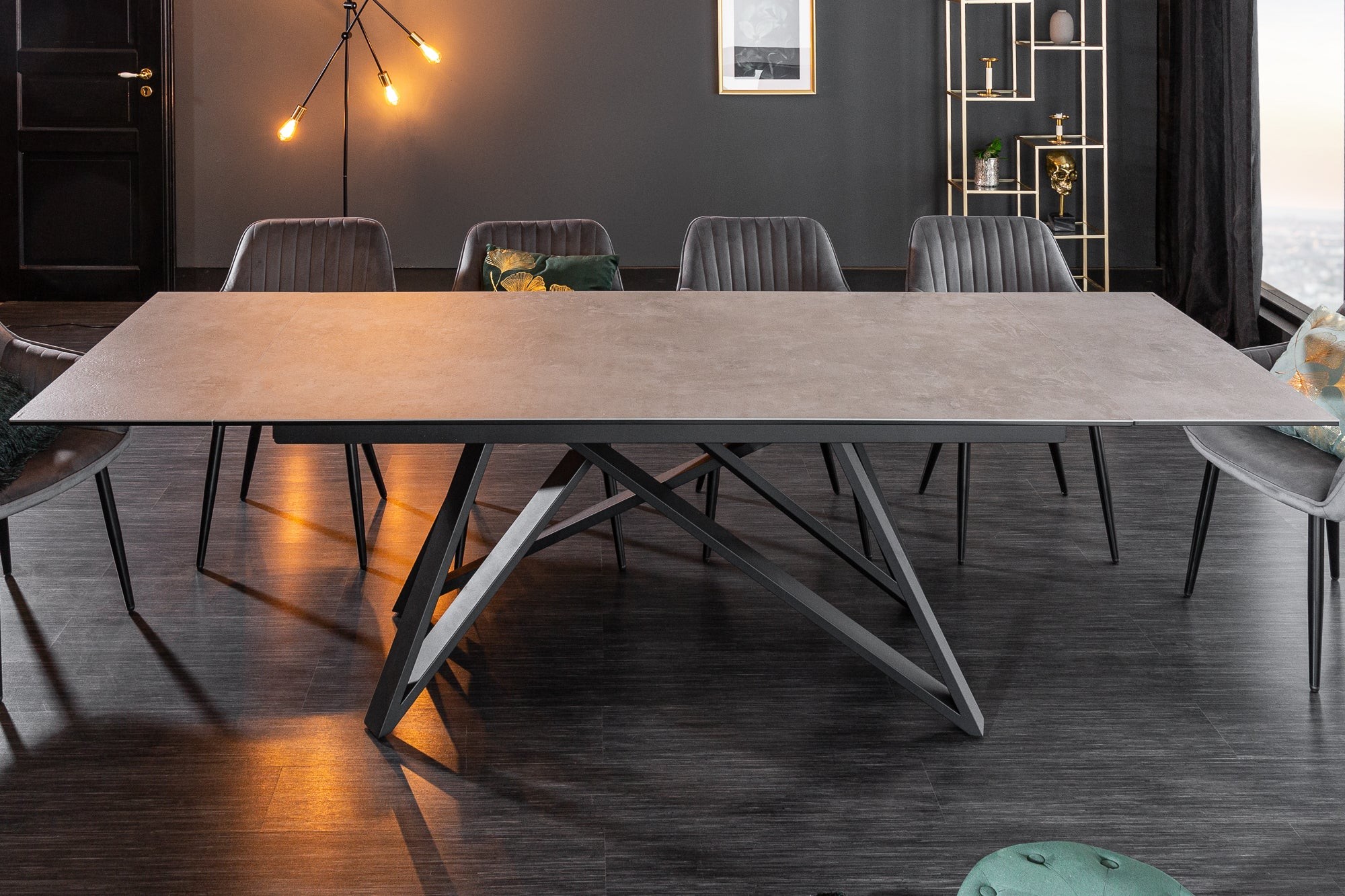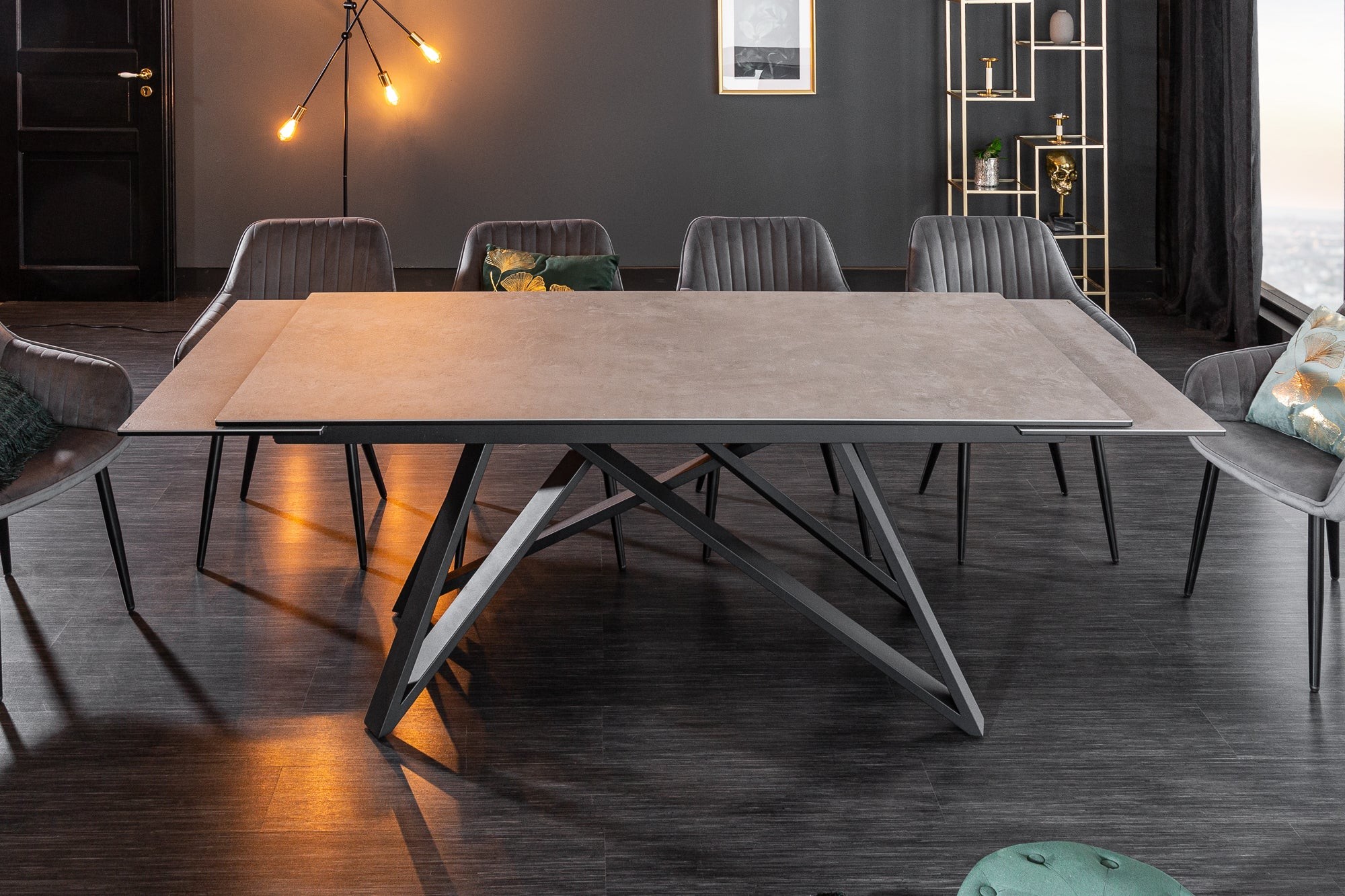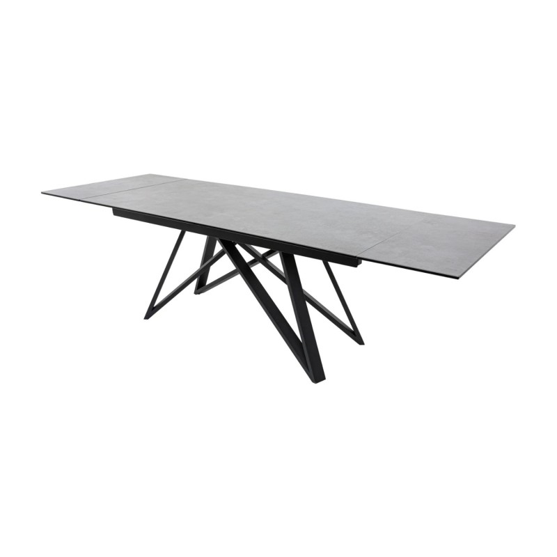 Alliez style moderne et praticité avec la table de salle à manger LIXOR. Son plateau en céramique effet ciment, renforcé par une base en verre trempé, lui confère un look urbain et raffiné. Grâce à sa structure métallique robuste et ses extensions dissimulées, elle s’adapte facilement à toutes les occasions.