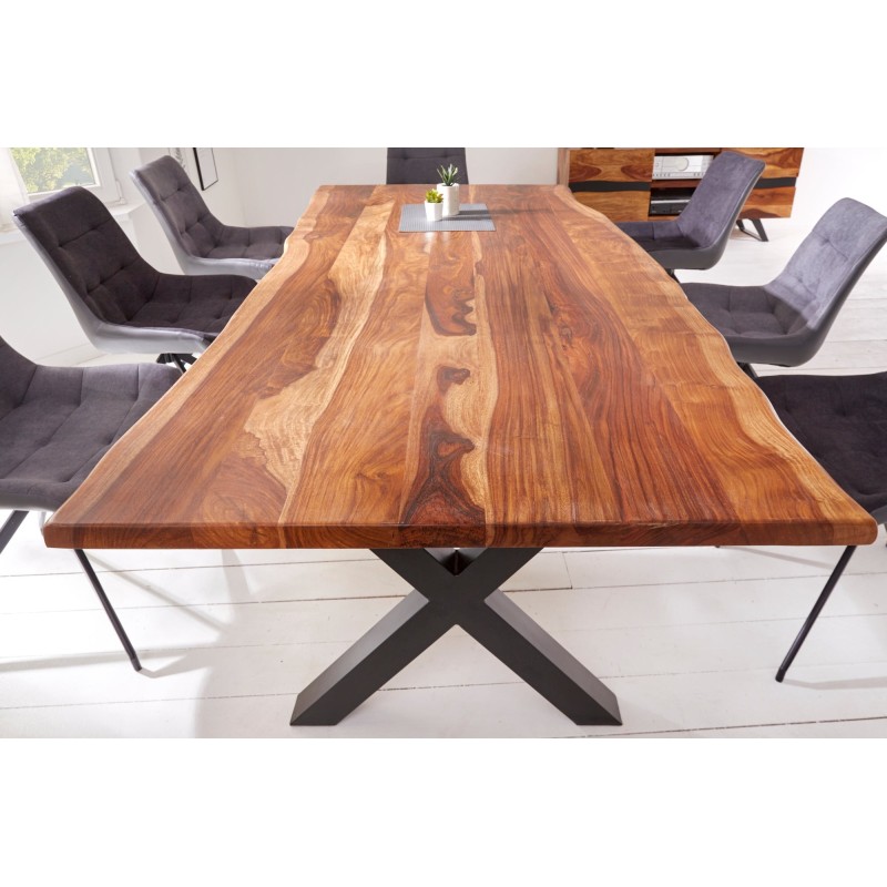 Découvrez le charme brut et la qualité artisanale de la table de salle à manger ORKAN. Entièrement conçue à la main, cette table associe un plateau en bois massif de sheesham verni à une structure en métal noir pour un rendu aussi robuste qu’élégant. Chaque modèle est unique grâce à son bord naturel qui souligne la noblesse du bois.