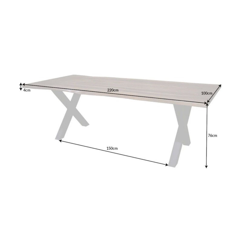 Cette table ORKAN au format généreux de 220 cm offre une large surface d’accueil idéale pour recevoir famille et amis. Son plateau épais en bois massif repose sur des pieds robustes de 7,5 x 7,5 cm, espacés de 115 cm pour une stabilité optimale. Son design industriel s’intègre aussi bien dans une déco contemporaine que rustique.