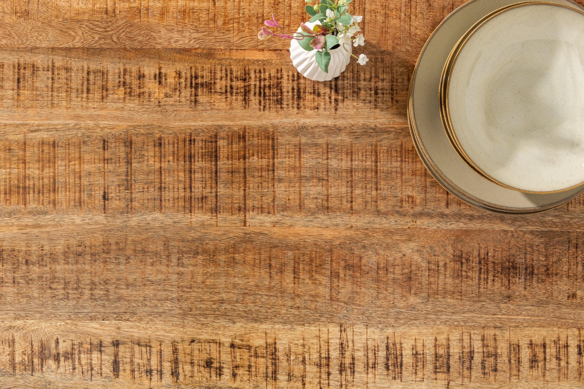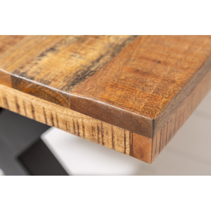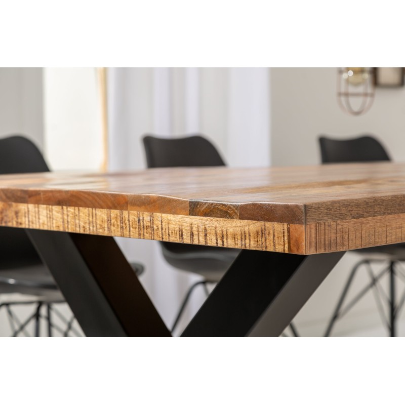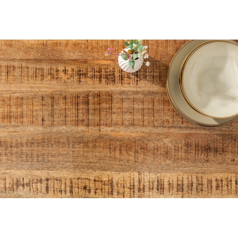 Chaque table LODEN est une véritable œuvre artisanale. Les planches de bois présentent des irrégularités naturelles, des nuances de teinte et des traces de scie qui renforcent le caractère unique de chaque pièce. Les finitions vernies mettent en valeur la richesse du manguier tout en assurant une excellente durabilité.