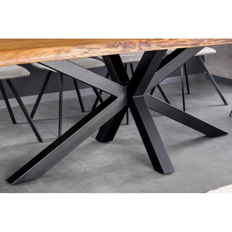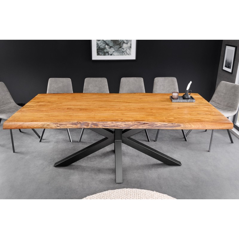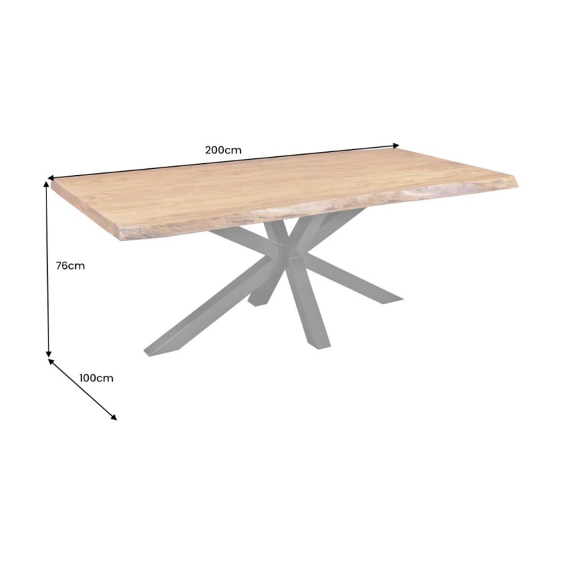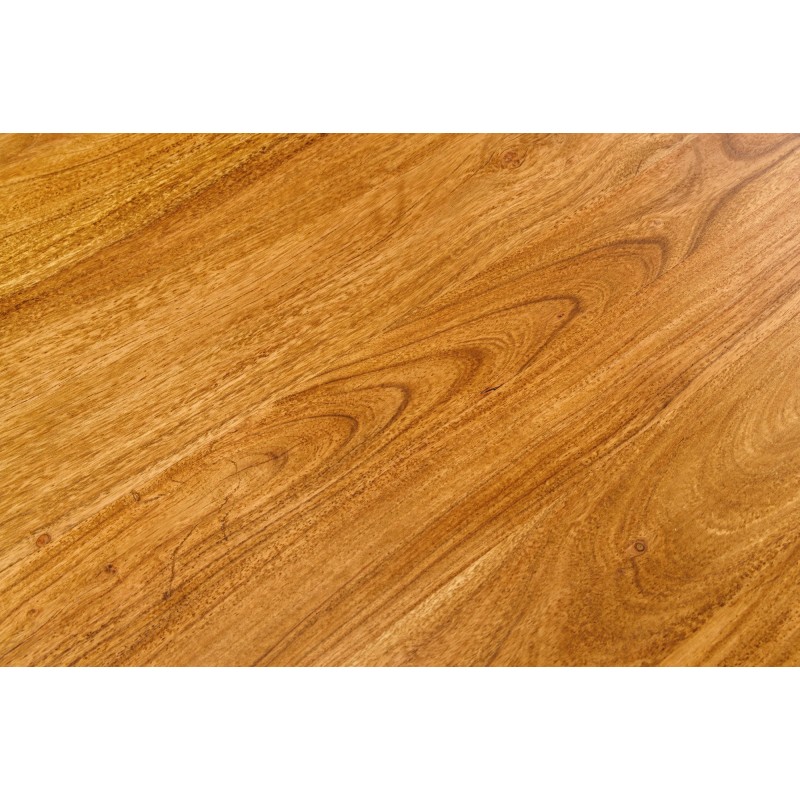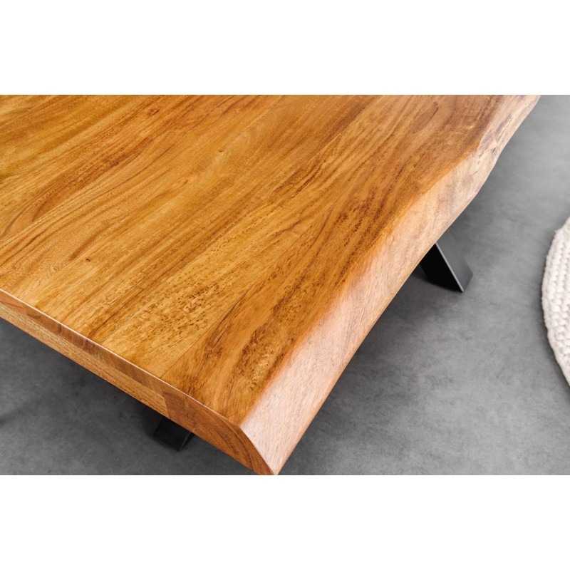 Le plateau en bois massif d’acacia offre une texture riche et vivante, où chaque veinure raconte l’histoire du bois. Son vernis transparent sublime la matière sans altérer son authenticité. Le bord naturel du plateau, soigneusement préservé, souligne l’esprit brut du design et fait de chaque table une création unique. L’épaisseur du plateau de 50 mm accentue la sensation de robustesse et de solidité, tandis que la base métallique noire vient contraster avec douceur la chaleur du bois.