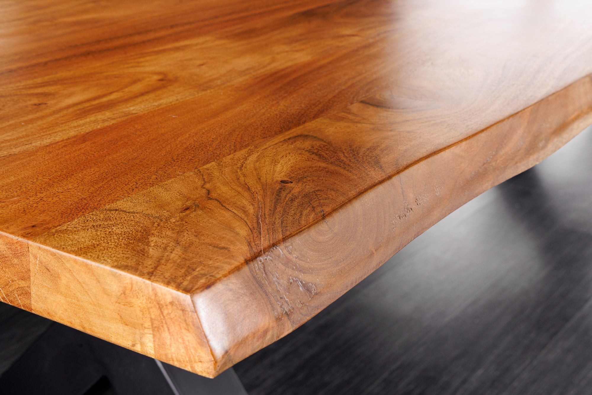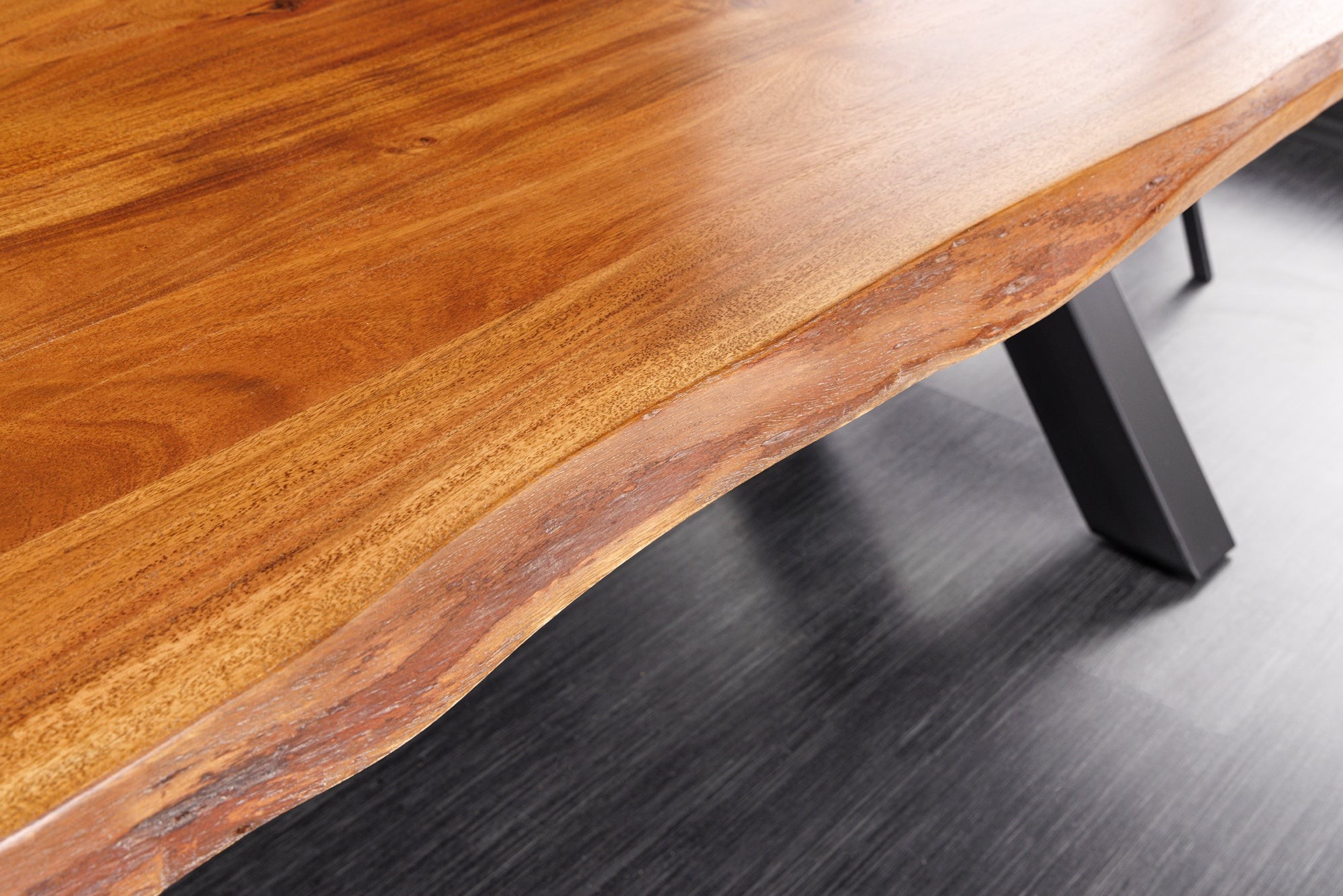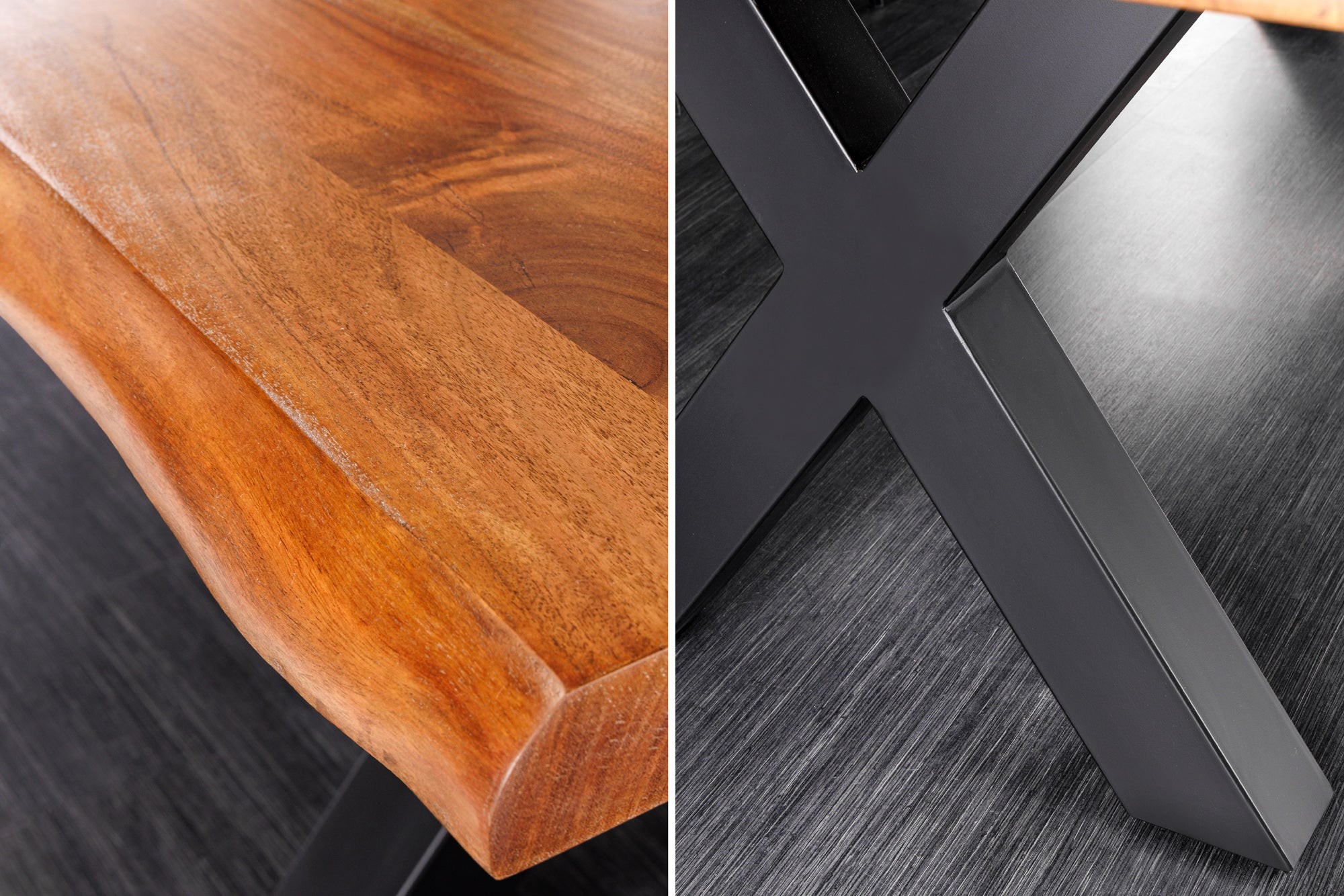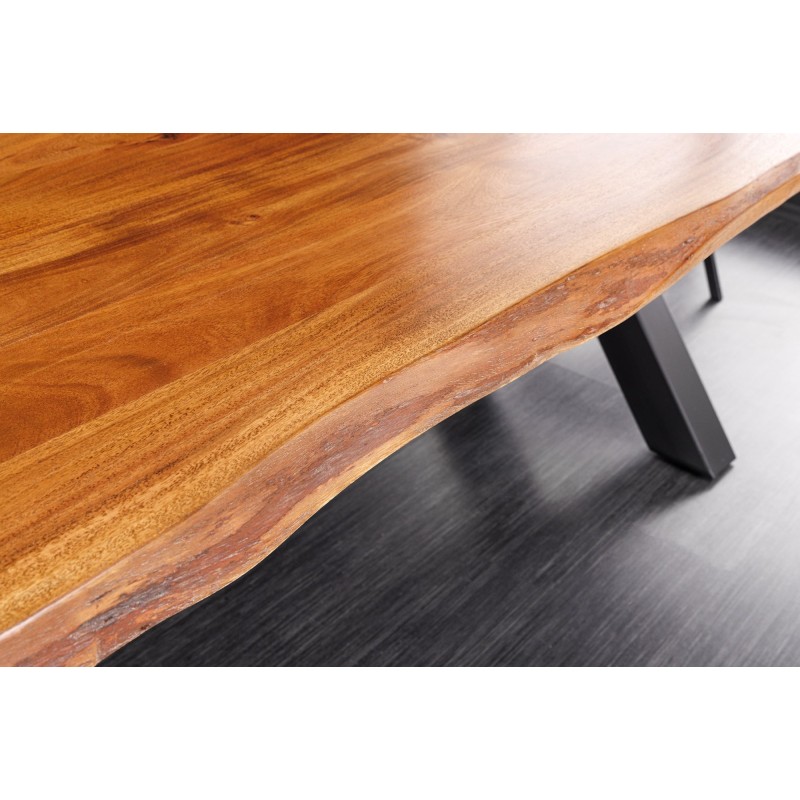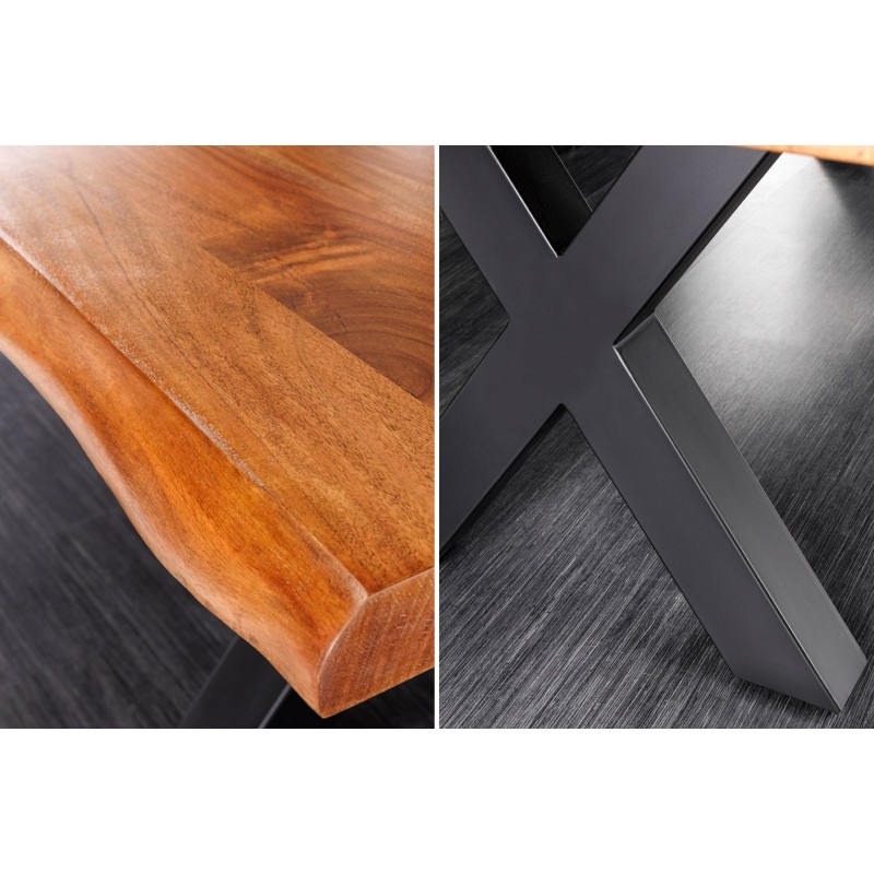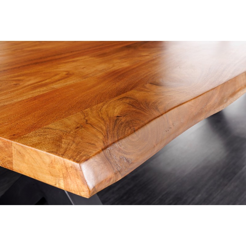 Chaque détail de la table ARKAYA témoigne d’un travail artisanal de qualité. Son plateau en bois massif d’acacia, sélectionné pour sa solidité et ses nuances chaleureuses, est sublimé par une finition vernie qui met en valeur les veines et les reliefs naturels du bois. Les bords irréguliers, préservés volontairement, rappellent l’origine naturelle de la matière et font de chaque table une création unique. Sa base en métal noir, stable et angulaire, renforce le style industriel tout en assurant une solidité sans faille.