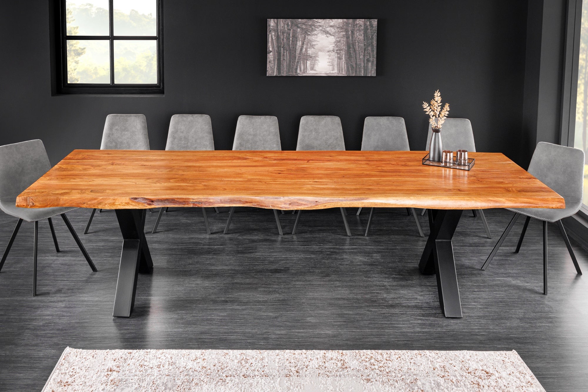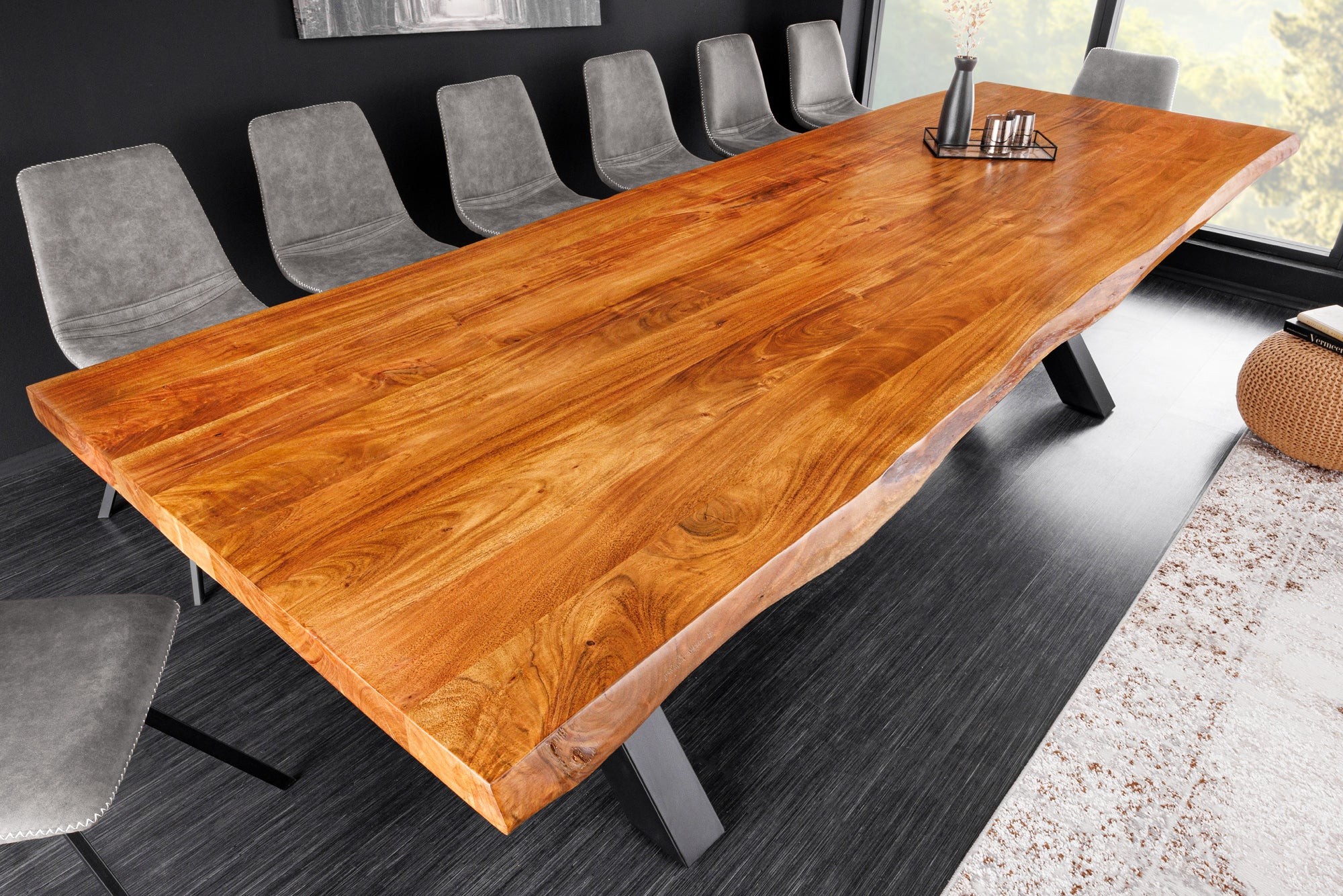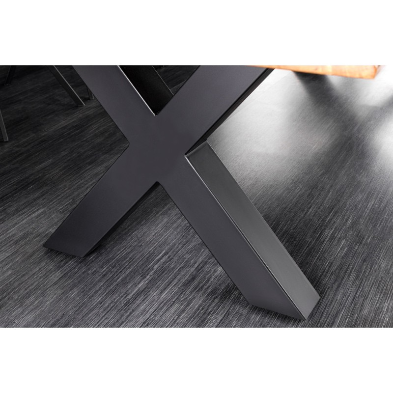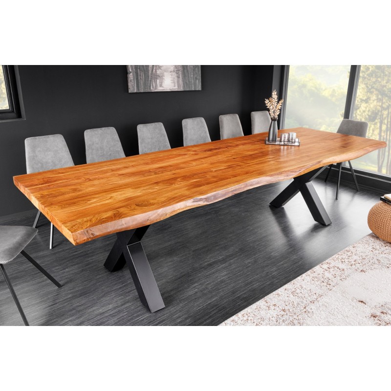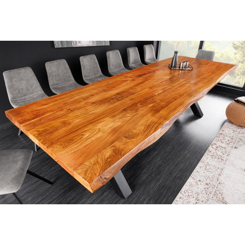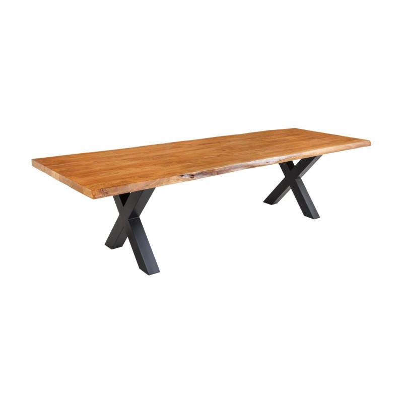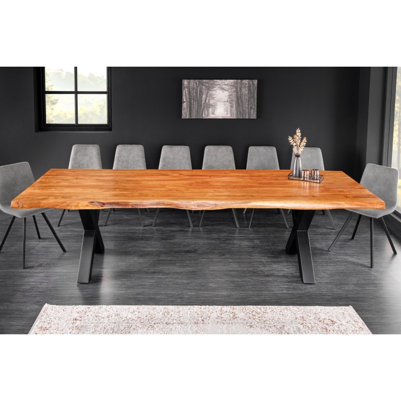 La table de salle à manger ARKAYA est une véritable pièce maîtresse qui incarne la rencontre entre la noblesse du bois massif d’acacia verni et la force du métal noir. Avec sa longueur impressionnante de 300 cm et son plateau épais de 55 mm, elle se distingue par son caractère affirmé et son style industriel haut de gamme. Élégante, naturelle et robuste, elle transforme votre salle à manger en un espace convivial, où le charme du bois et la rigueur du métal s’harmonisent parfaitement.