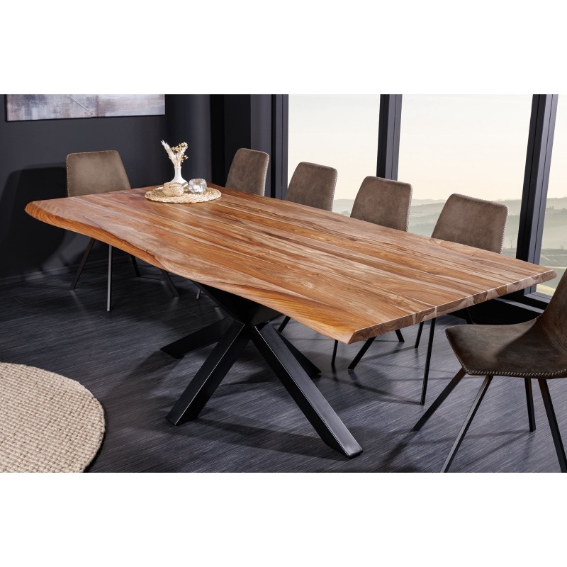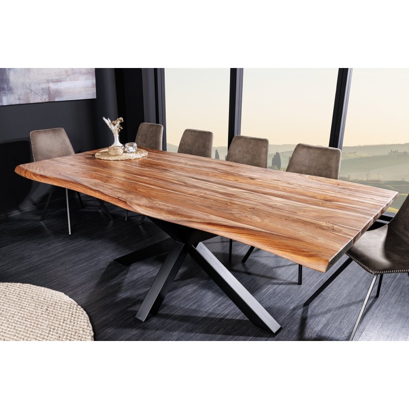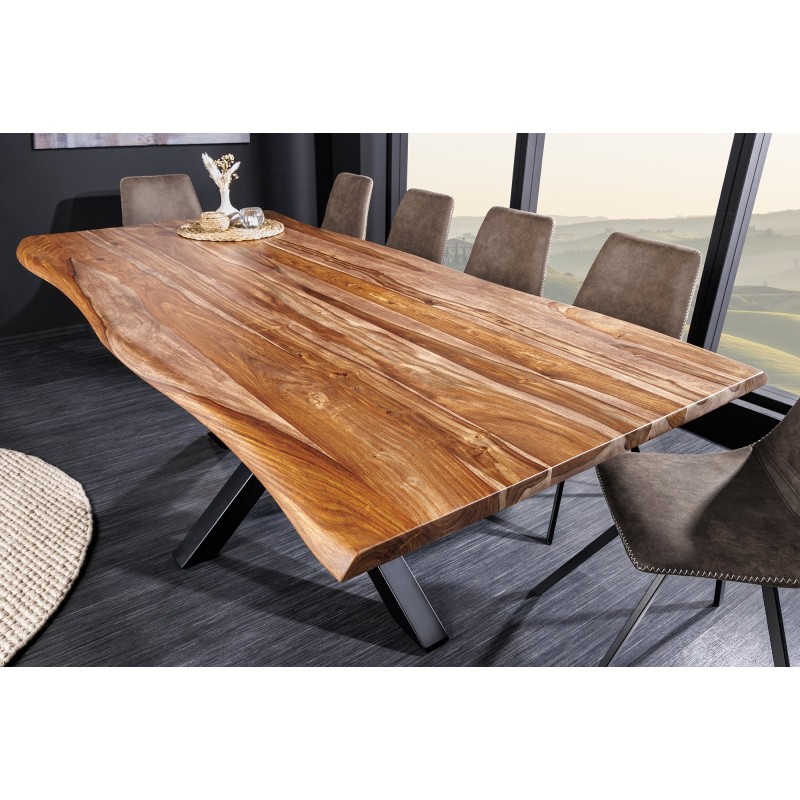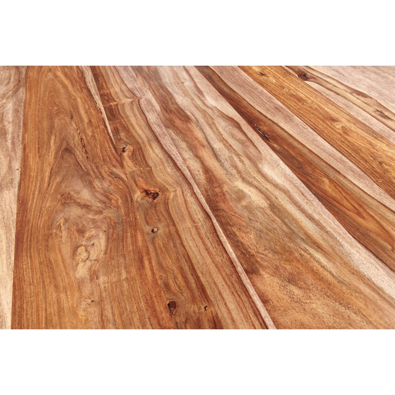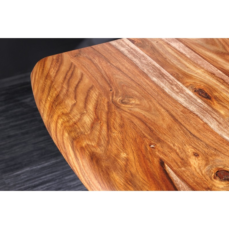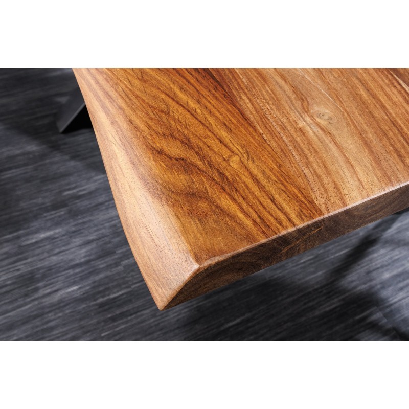 Le plateau en sheesham massif met en avant des veines contrastées et une texture riche, rehaussée par une finition vernie qui protège le bois tout en préservant son authenticité. Les bords naturels apportent une touche artisanale unique, tandis que la base métallique noire assure stabilité et caractère. Sa capacité de charge élevée de 200 kg souligne la solidité du meuble, idéal pour un usage intensif et quotidien.