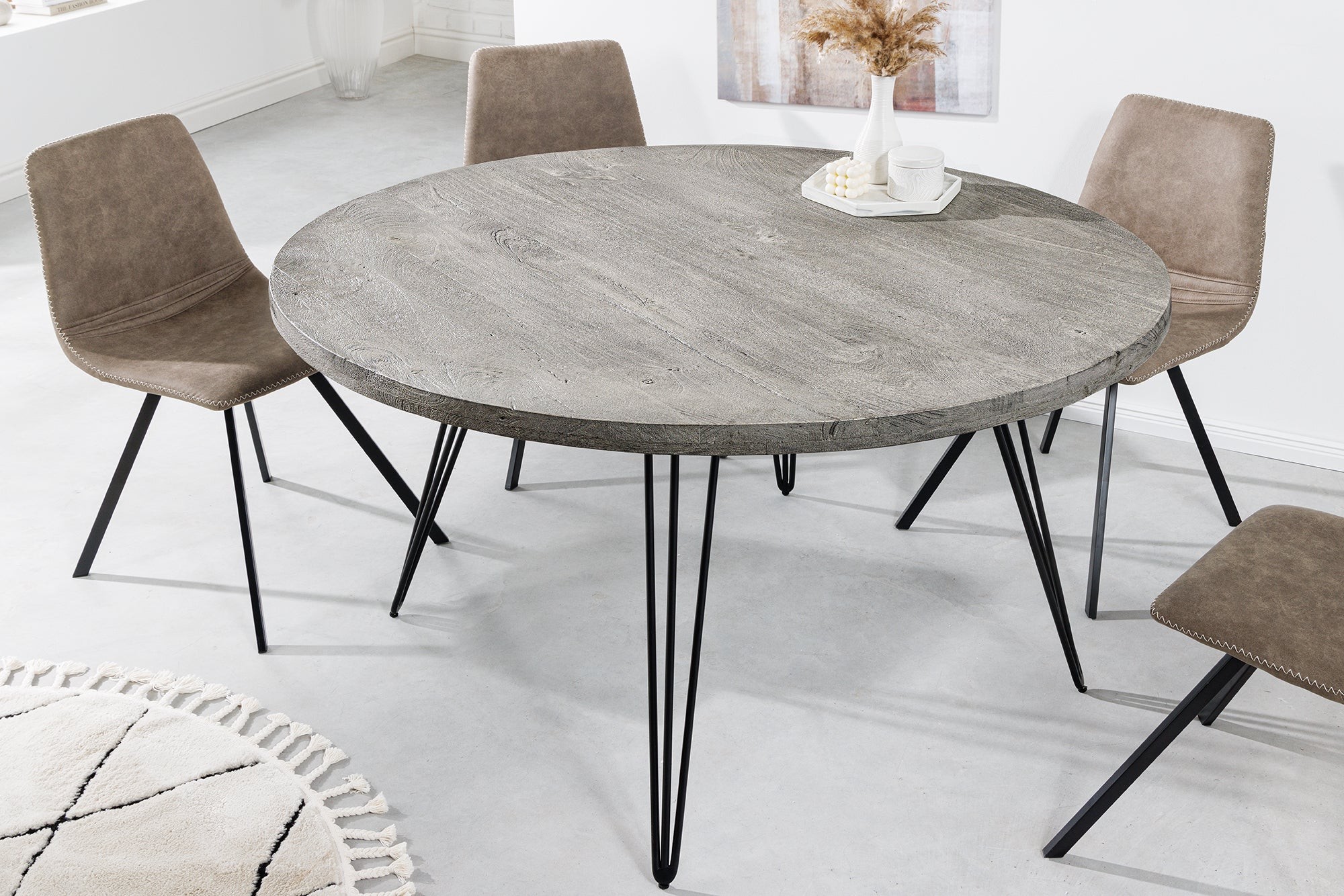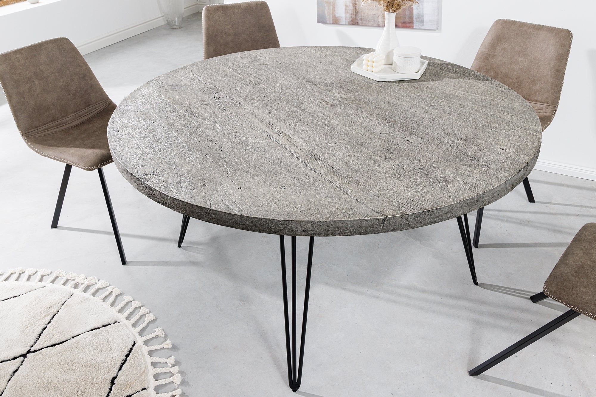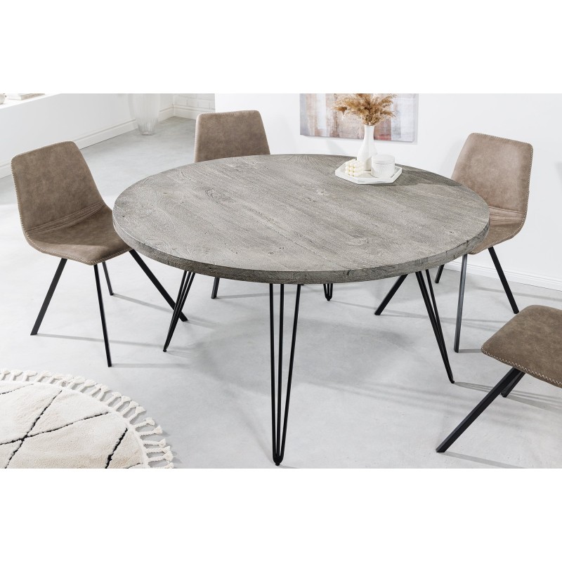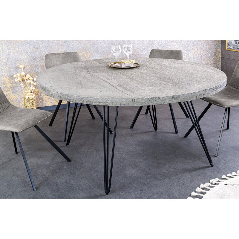 La table de salle à manger SILVA séduit par son design à la fois moderne et naturel. Son plateau rond en bois de manguier gris repose sur une structure en métal noir fine et élégante, offrant une allure aérienne et un contraste visuel harmonieux. Compacte et conviviale, elle trouvera facilement sa place dans un salon ou une cuisine à la décoration contemporaine.