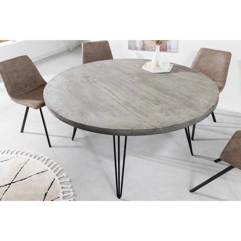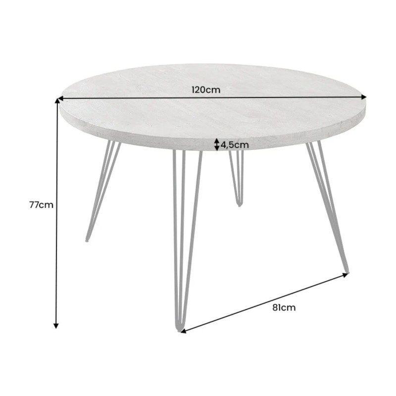 Avec son diamètre de 120 cm, la SILVA accueille confortablement jusqu’à 4 personnes. Le bois de manguier massif apporte une texture naturelle et chaleureuse, tandis que les pieds en métal noir renforcent son esprit industriel. Sa distance entre les pieds de 81 cm assure une bonne stabilité tout en laissant une place généreuse pour les jambes.