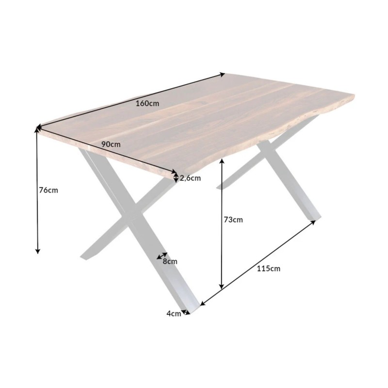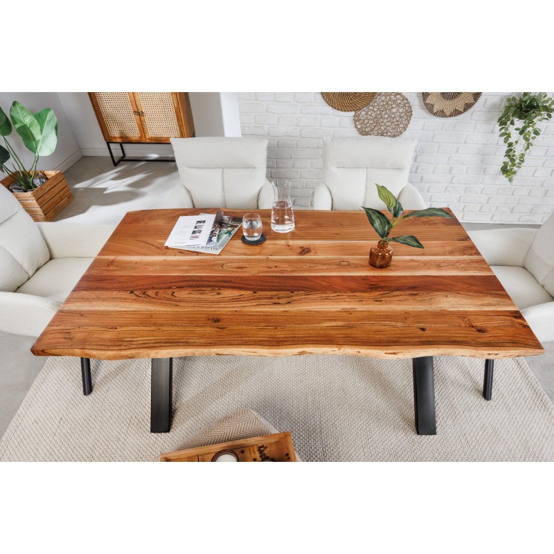 Le plateau de 26 mm d’épaisseur met en valeur les nuances naturelles du bois d’acacia, tandis que les pieds en métal en X assurent une excellente stabilité. Sa distance entre les pieds de 115 cm permet une assise confortable et spacieuse pour vos convives. Élégante et fonctionnelle, cette table incarne parfaitement l’esprit du mobilier industriel.