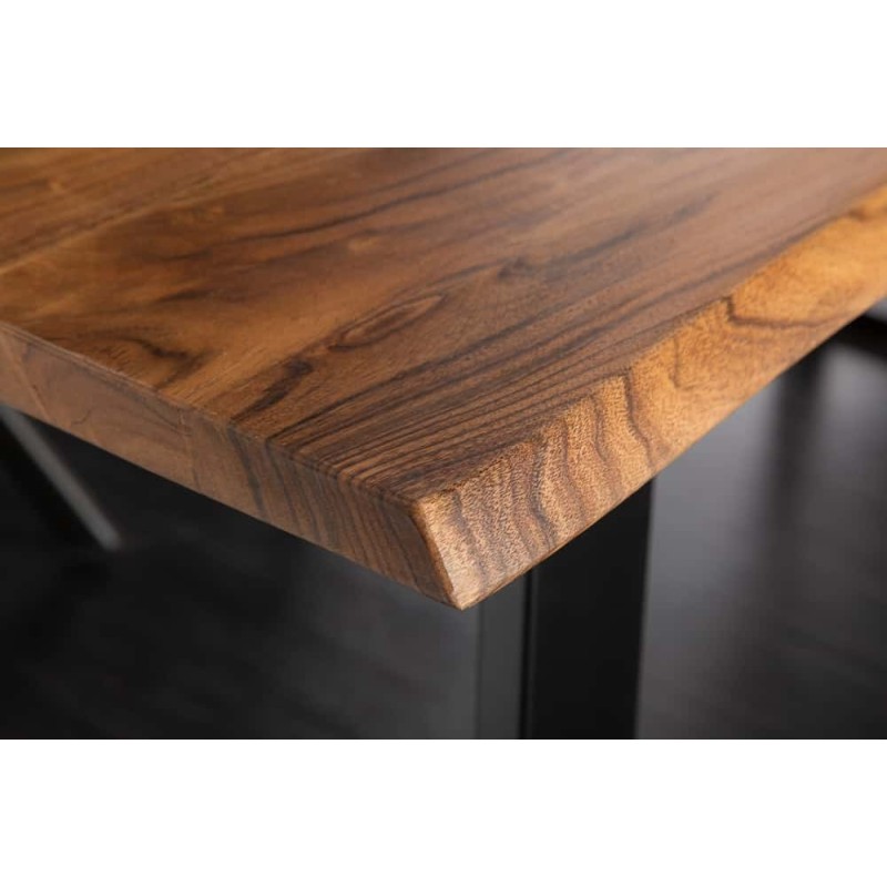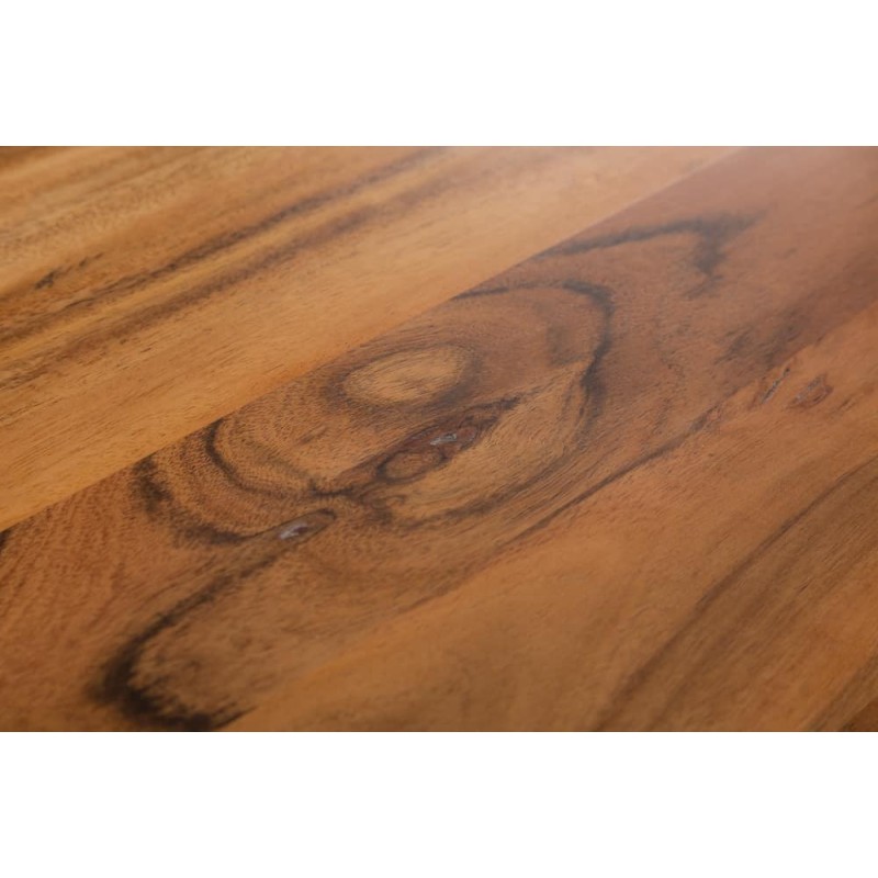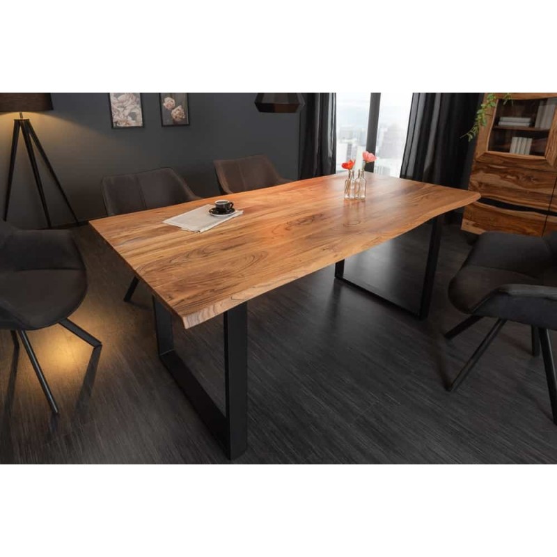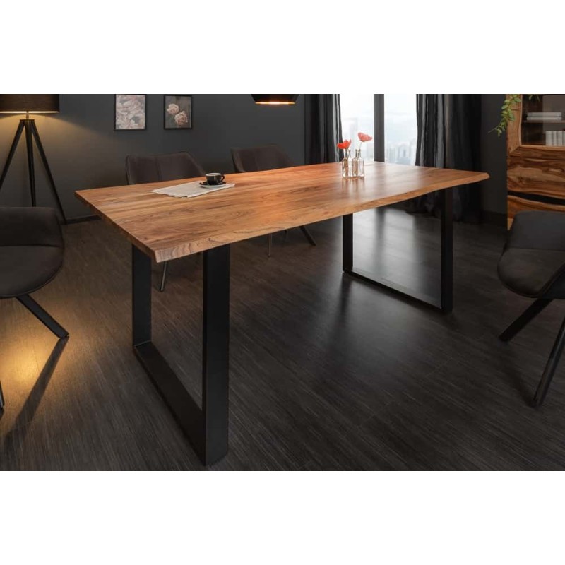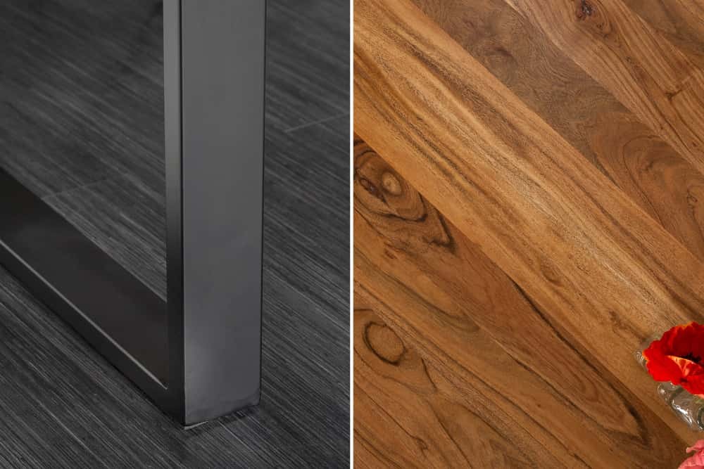 Son plateau en bois d’acacia massif de 26 mm d’épaisseur révèle un veinage riche et unique, mis en valeur par une finition vernie qui protège durablement la surface. Les pieds métalliques en U, aux dimensions de 7,5 × 2,5 cm, assurent une stabilité optimale tout en renforçant le caractère moderne du meuble. Chaque détail est pensé pour offrir une table durable, élégante et facile à entretenir.