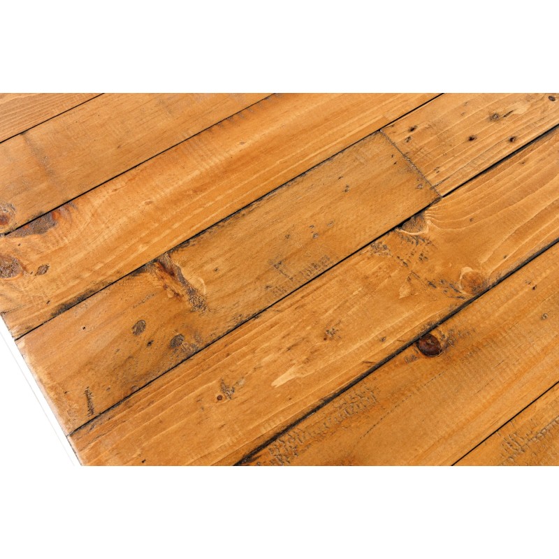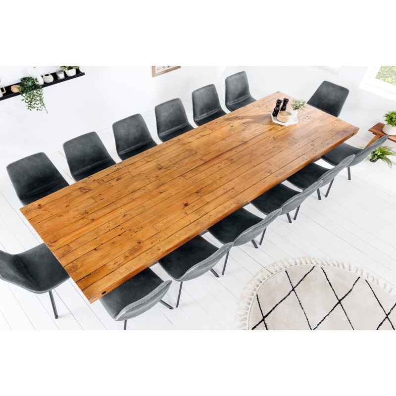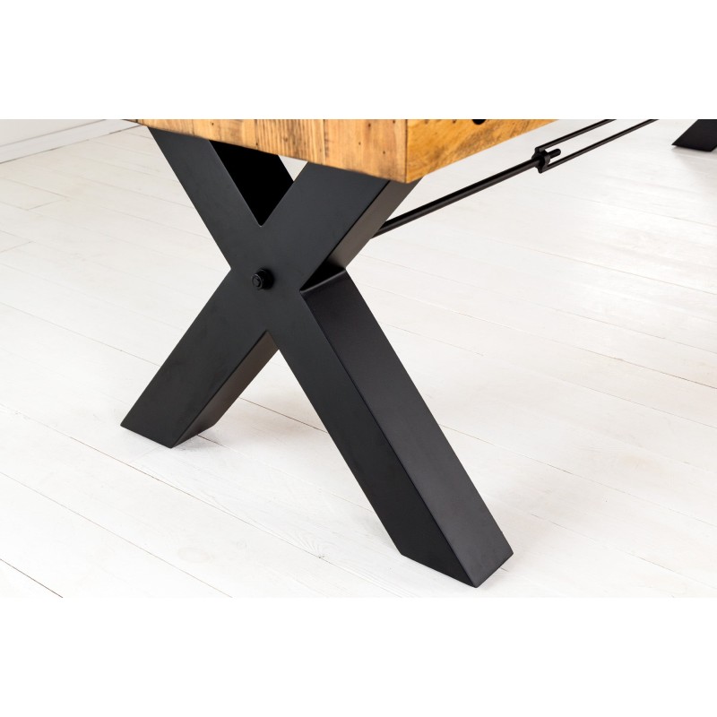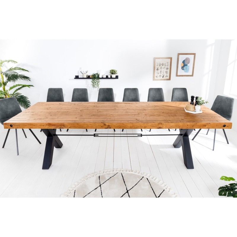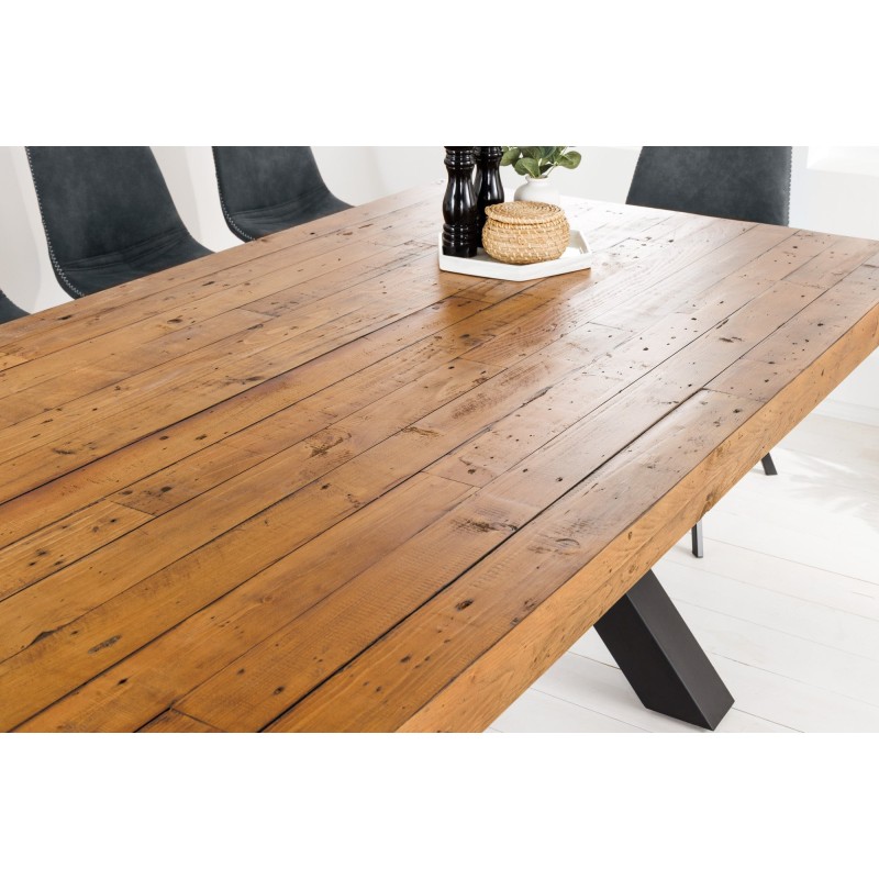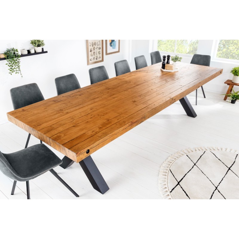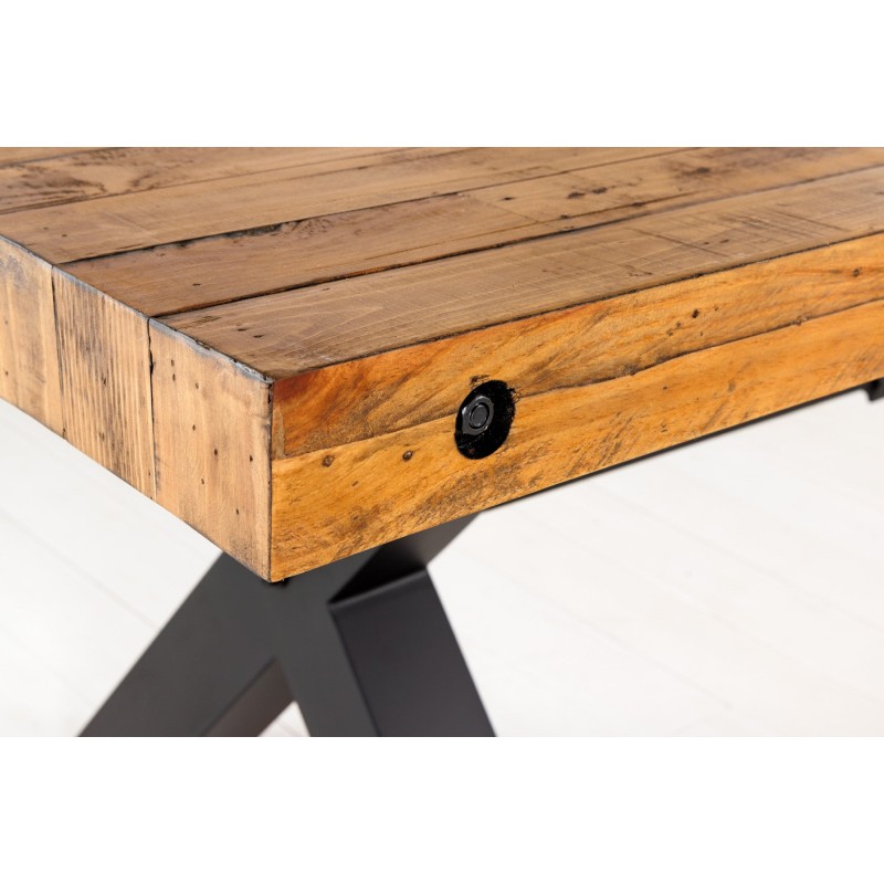 Chaque détail de la table CAVARA met en valeur le travail artisanal du bois recyclé, dont les irrégularités naturelles racontent une histoire unique. Le contraste entre le bois chaleureux et le métal noir crée une atmosphère brute et élégante, typique du mobilier industriel. Son épais plateau de 80 mm repose sur des pieds en X de 10 × 10 cm, garantissant une stabilité parfaite même sur une grande longueur.