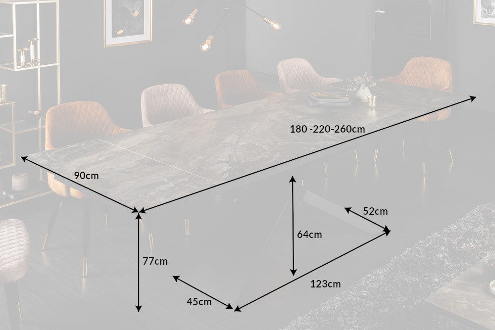 Grâce à son système d’allonges intégré, la table STELIX passe facilement de 180 cm à 220 cm, puis jusqu’à 260 cm. Une solution idéale pour accueillir vos proches confortablement tout en préservant l’harmonie de votre espace. Son plateau de 130 mm d’épaisseur et la distance entre les pieds de 123 cm assurent une grande stabilité et un confort optimal.