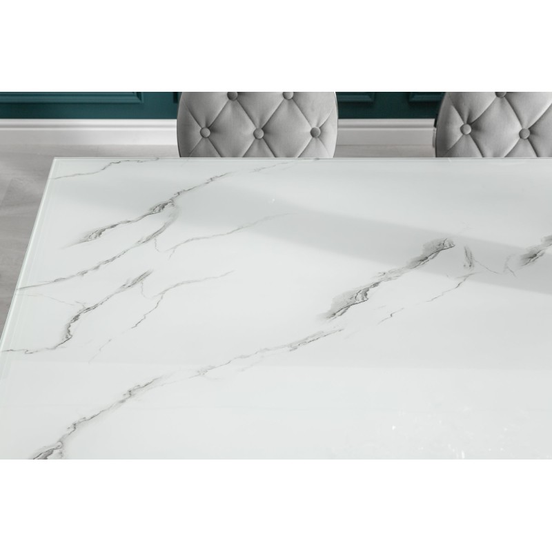 La table VELENA est une pièce d’exception qui allie raffinement et modernité. Son plateau en verre trempé effet marbre blanc capte la lumière et apporte une touche d’élégance à votre espace repas. Sa structure en acier argenté poli vient sublimer l’ensemble, offrant une finition luxueuse et contemporaine.