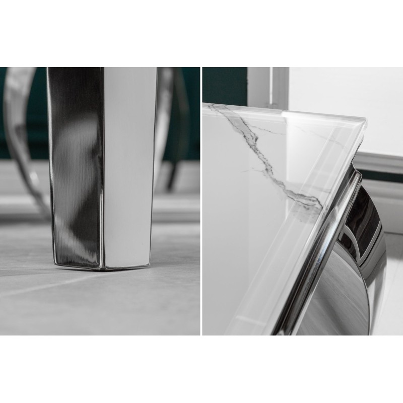| Structure | Structure en acier poli argenté et plateau en verre effet marbre blanc |