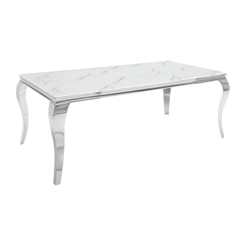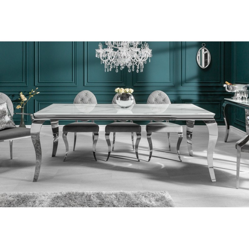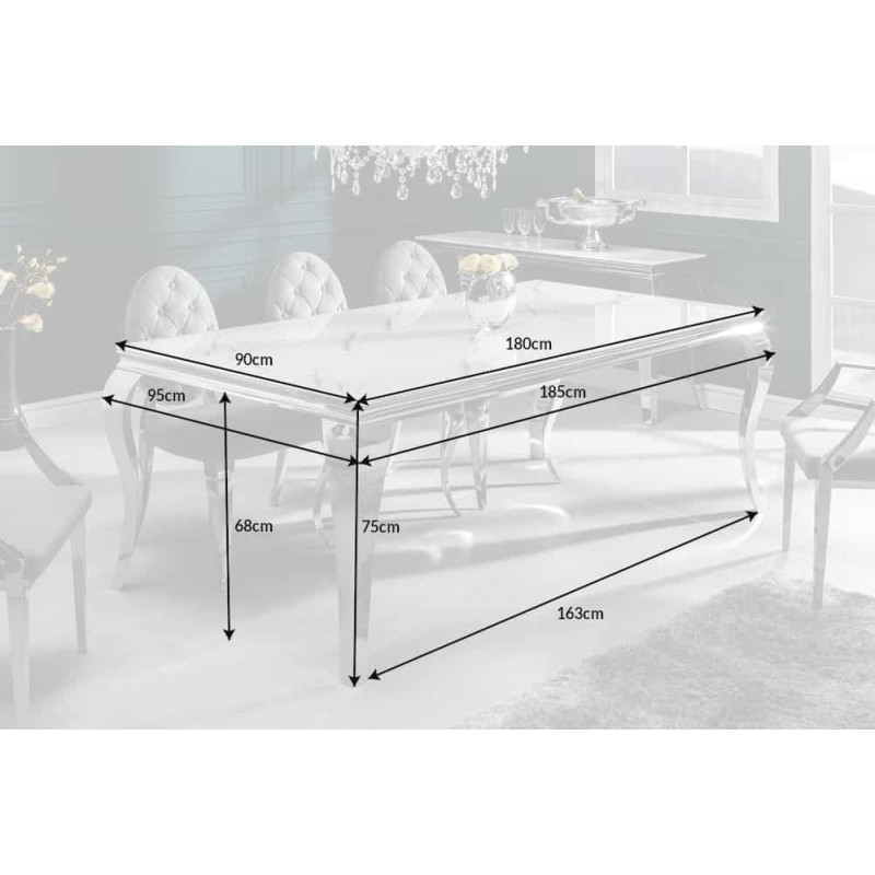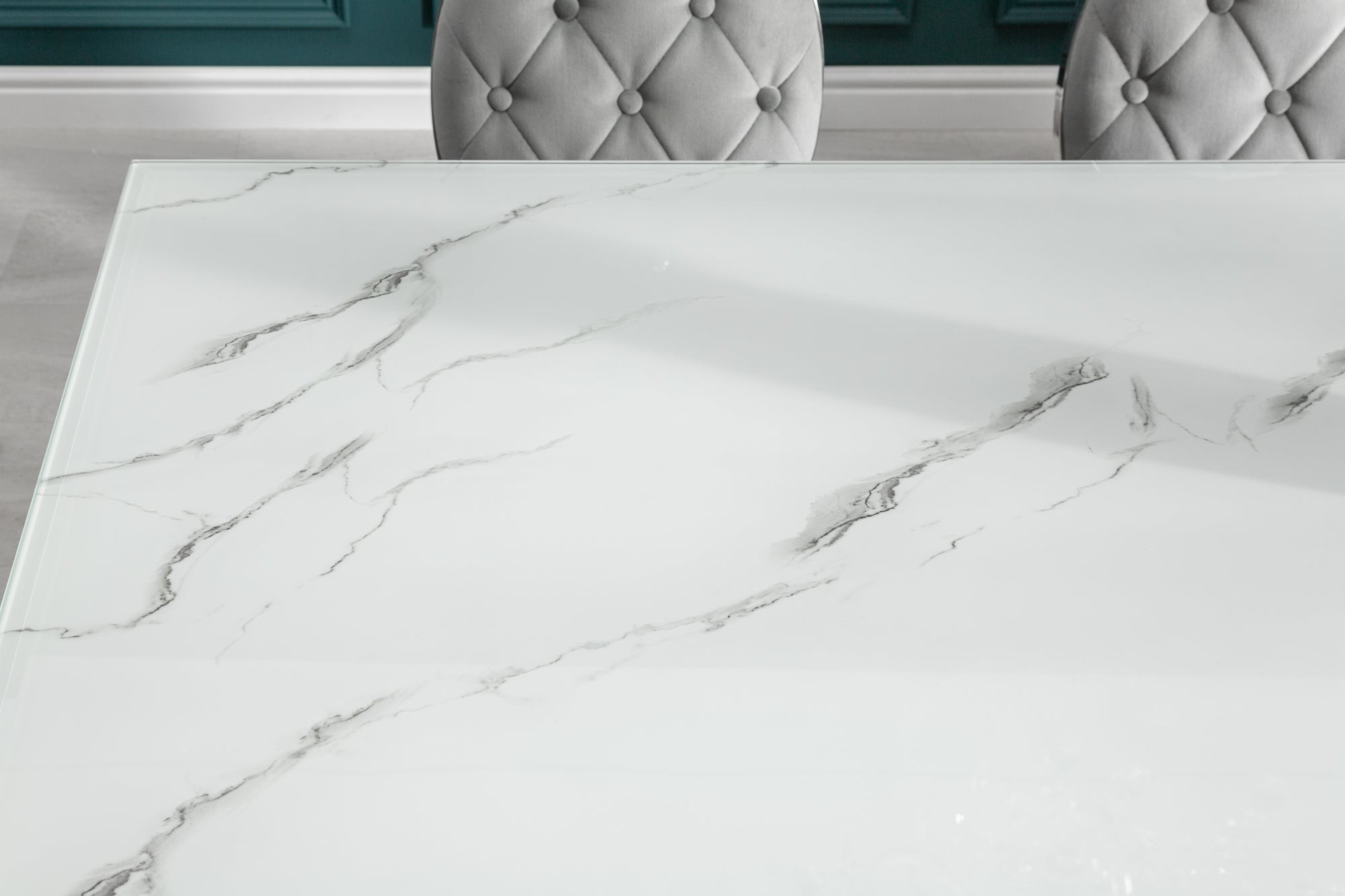 Avec sa finition effet marbre et ses reflets argentés, la table VELENA est un véritable bijou décoratif. Elle s’accorde aisément avec des chaises modernes ou baroques pour un rendu harmonieux et sophistiqué.