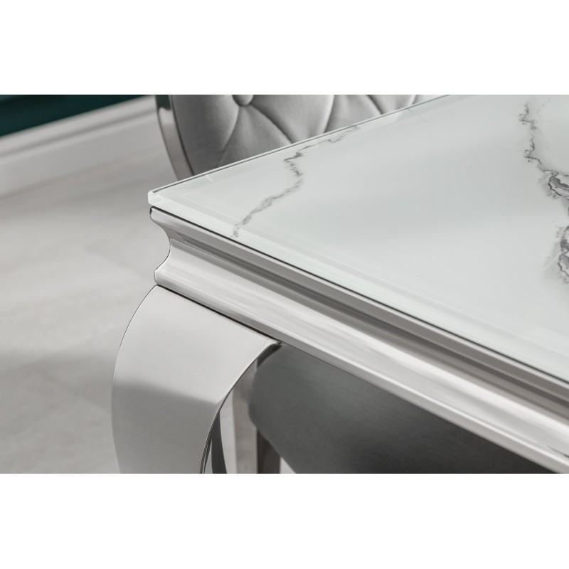 Offrez à votre pièce à vivre un style chic et raffiné avec la table VELENA. Son plateau en verre trempé effet marbre blanc diffuse la lumière et apporte une atmosphère à la fois moderne et luxueuse. Associée à une structure en acier argenté poli, elle séduit par son design baroque revisité, parfait pour sublimer une salle à manger contemporaine.
