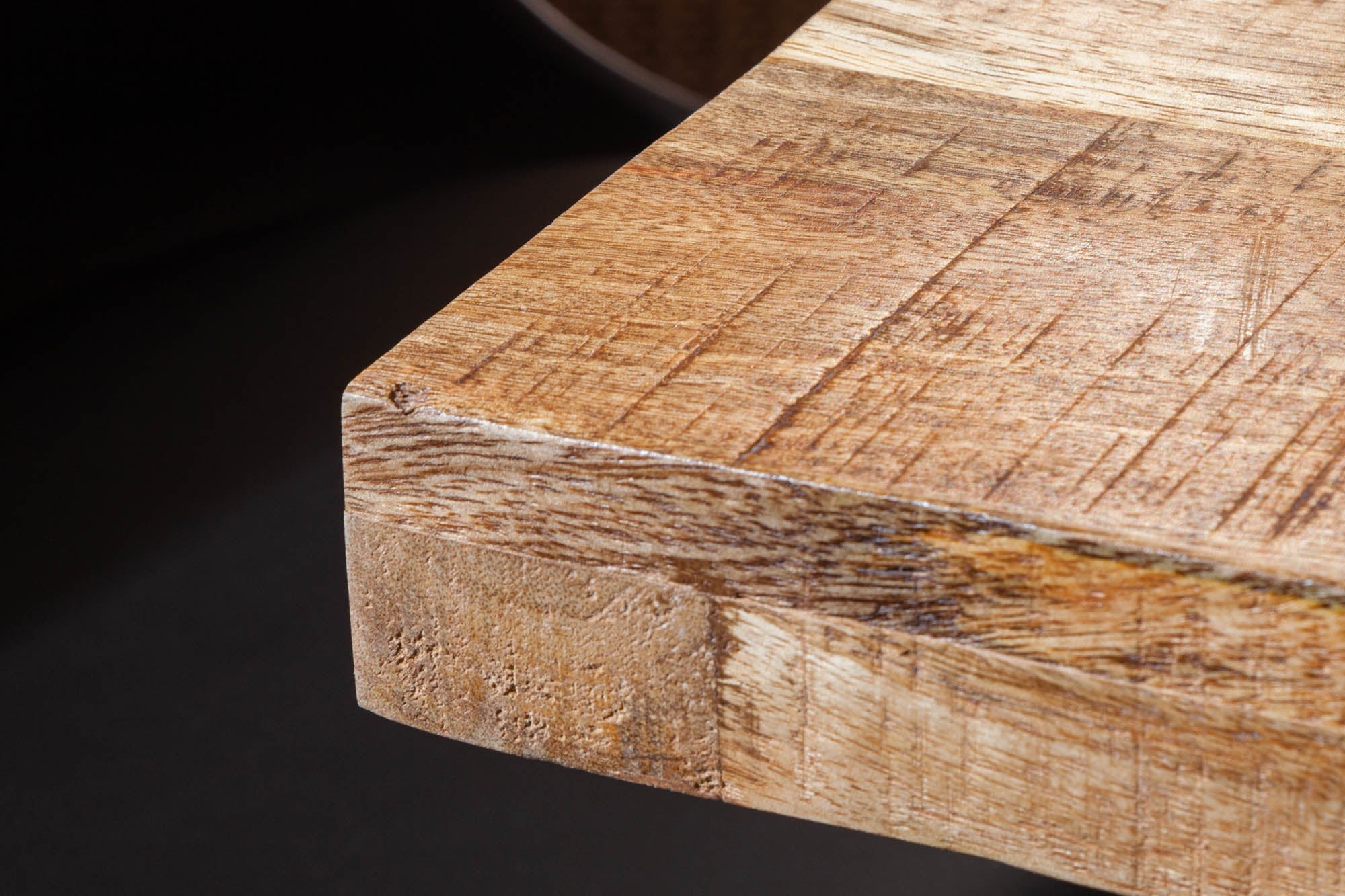 Le design de ce meuble impressionne par son caractère particulièrement individuel et frappant. La surface en planches légèrement ondulées a été pourvue de marques de scie rustiques et rayonne d’un charme qui lui est propre. Les inclusions et les dégradés de couleurs plus foncées donnent à chaque meuble une touche individuelle supplémentaire – attendez-vous à une pièce vraiment unique !