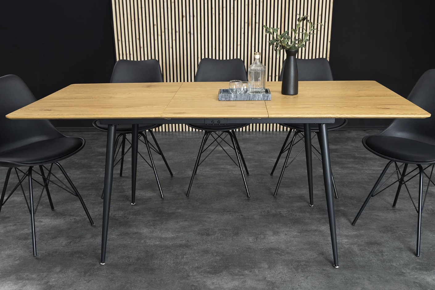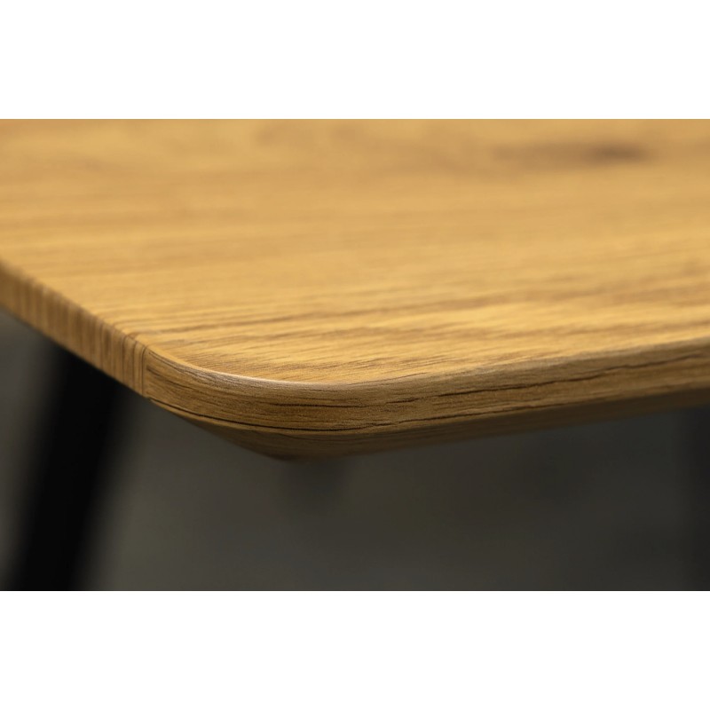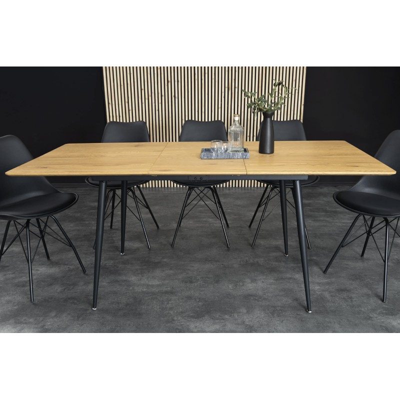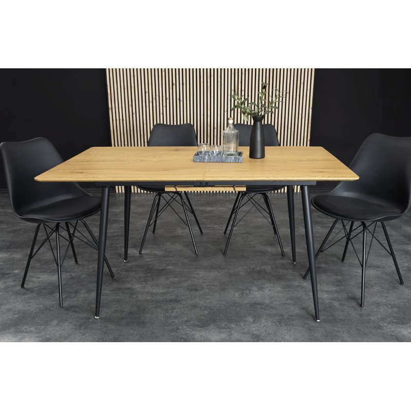 Cette table associe un plateau en MDF plaqué en véritable bois de chêne sauvage à des pieds en métal, garantissant solidité et stabilité. Le plateau biseauté apporte une touche design raffinée, tandis que le système extensible permet d’optimiser l’espace sans compromis sur l’esthétique.