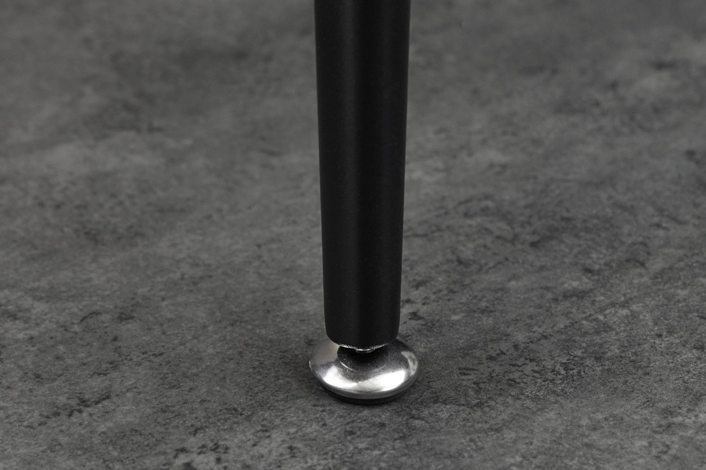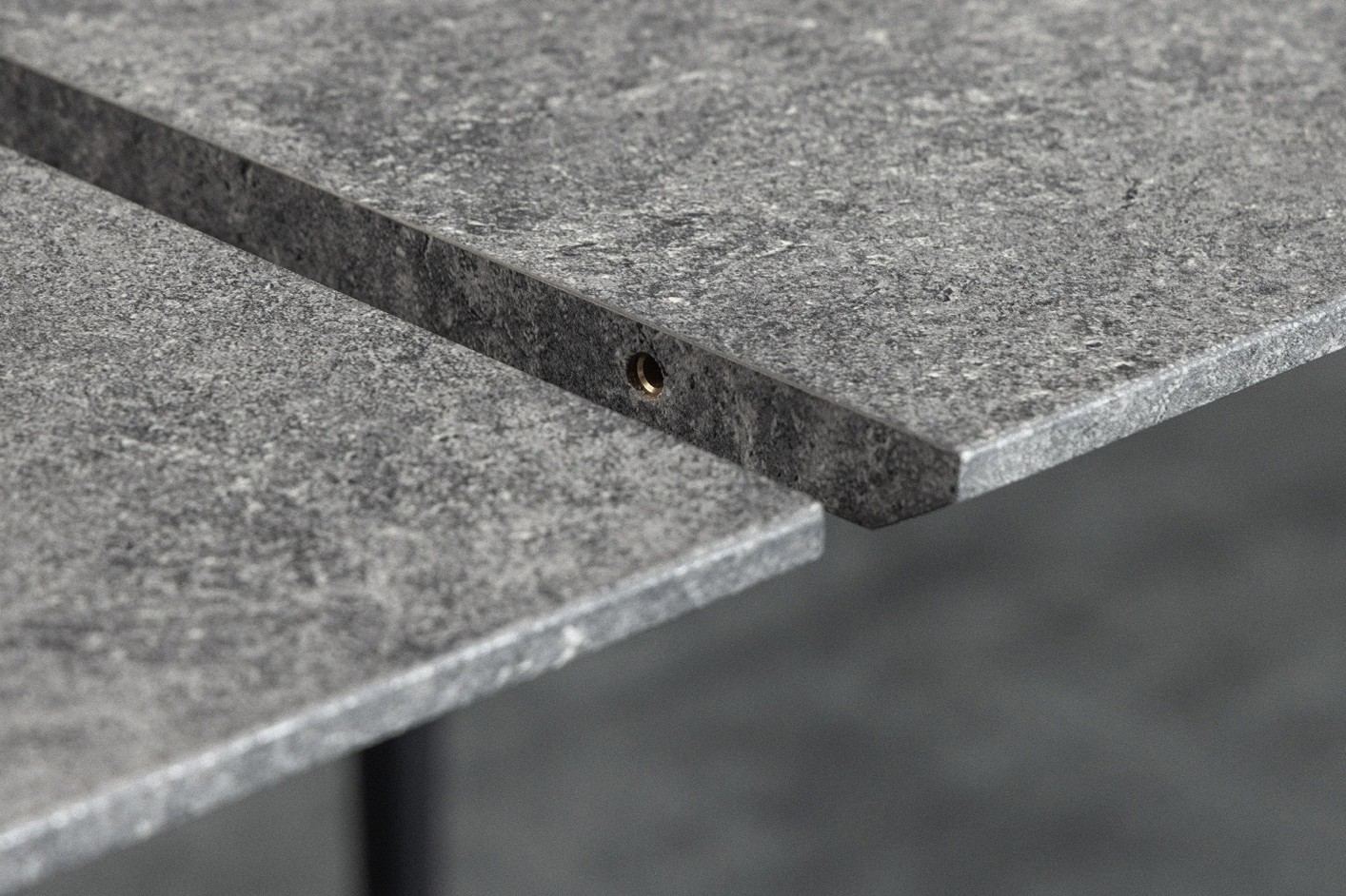 Cette table associe un plateau en MDF plaqué aspect pierre à des pieds en métal, créant un contraste élégant entre minéralité et modernité. Le plateau biseauté apporte une finition graphique subtile, tandis que la structure métallique garantit stabilité et durabilité à l’usage.
