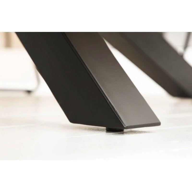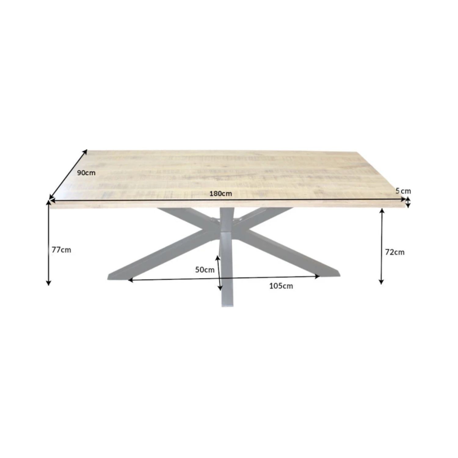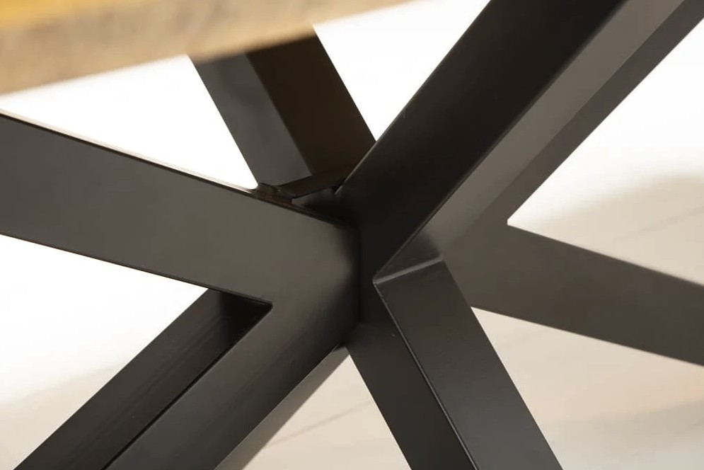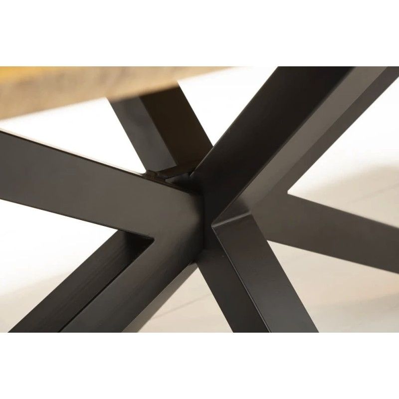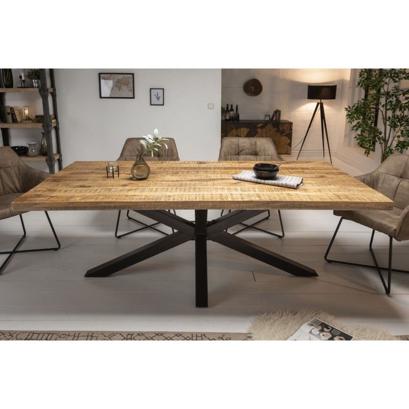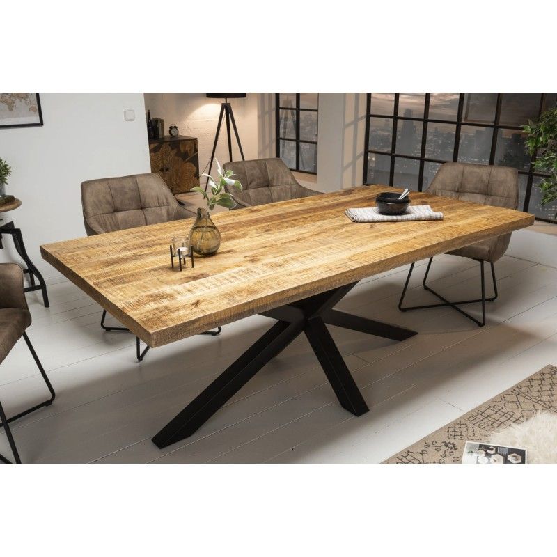 Son plateau massif de 55 mm d’épaisseur offre une stabilité irréprochable et met en valeur les nuances naturelles du bois de manguier. Le vernis protège la surface tout en conservant l’aspect brut du bois. Associée à sa base en métal noir, cette table incarne l’équilibre parfait entre robustesse, élégance et originalité.