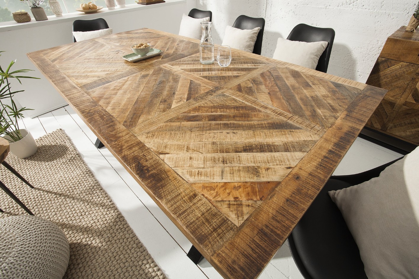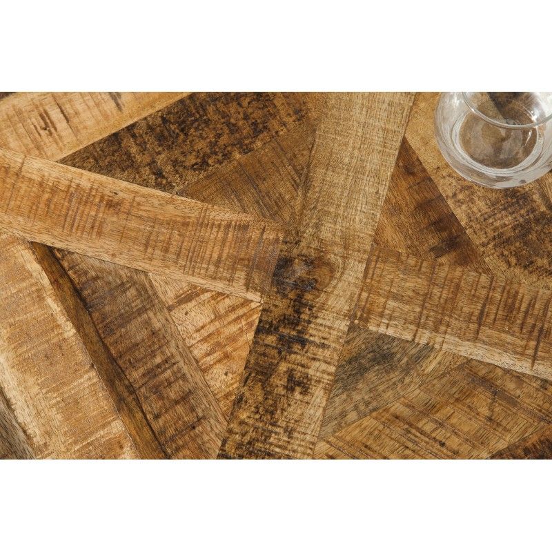 Son plateau en bois massif de 40 mm d’épaisseur repose sur une base en métal noir géométrique et stable. L’ensemble dégage une allure à la fois brute et élégante, parfaite pour les amateurs de style industriel et contemporain. Cette table deviendra sans aucun doute la pièce maîtresse de votre salle à manger.