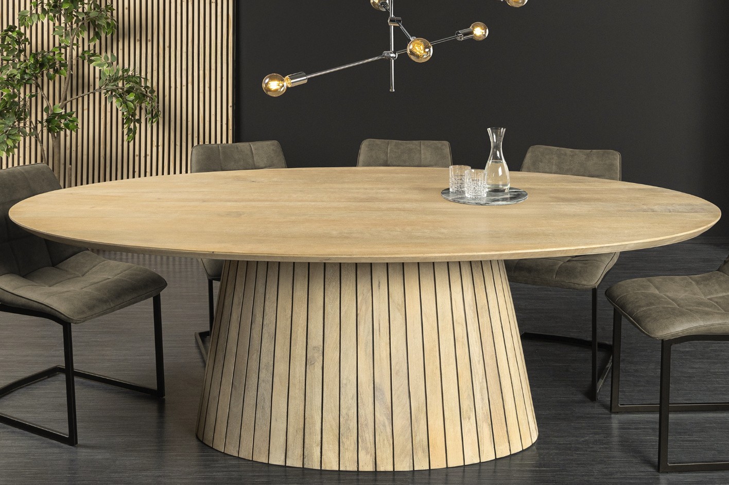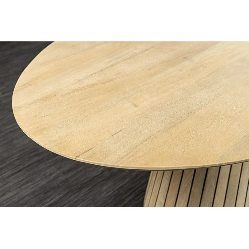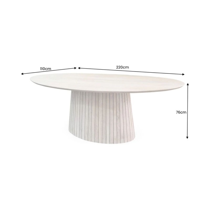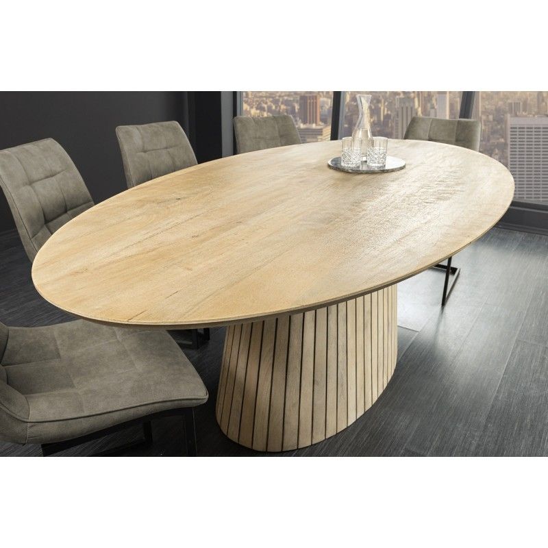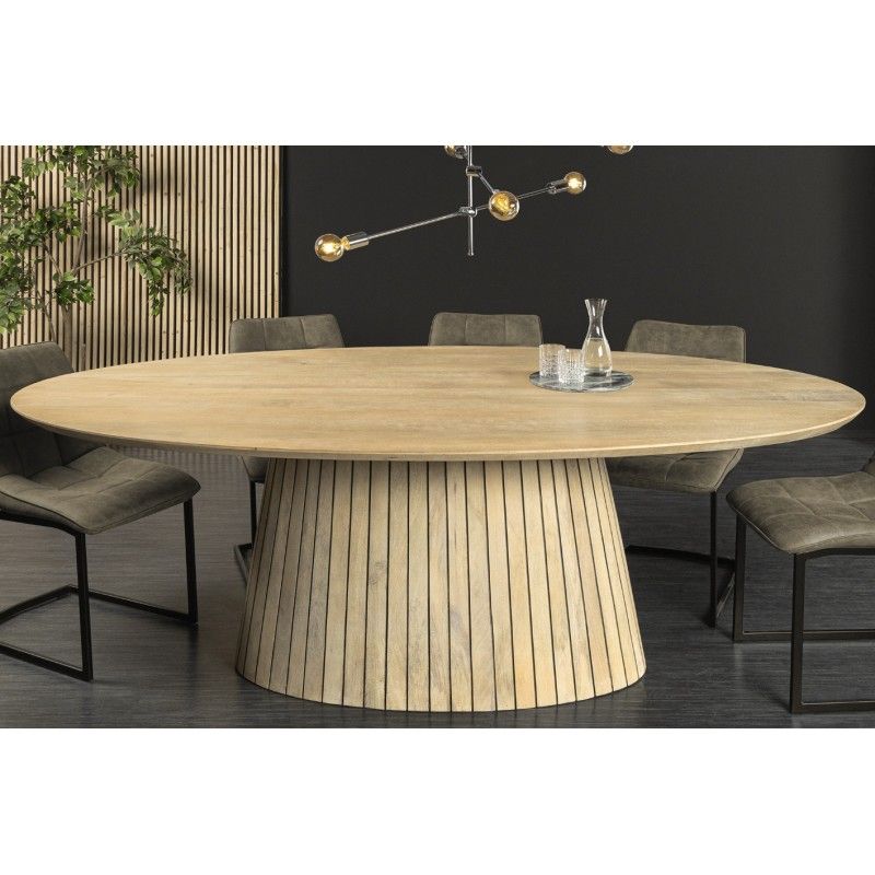 Le plateau en bois massif de 25 mm d’épaisseur est subtilement biseauté, pour une finition élégante et fluide. Sa teinte bois clair verni met en valeur les nuances du manguier, tandis que la structure en acacia et en manguier massif assure une stabilité parfaite. Sa forme ovale favorise la convivialité et adoucit l’espace, idéale pour les repas en famille ou entre amis.