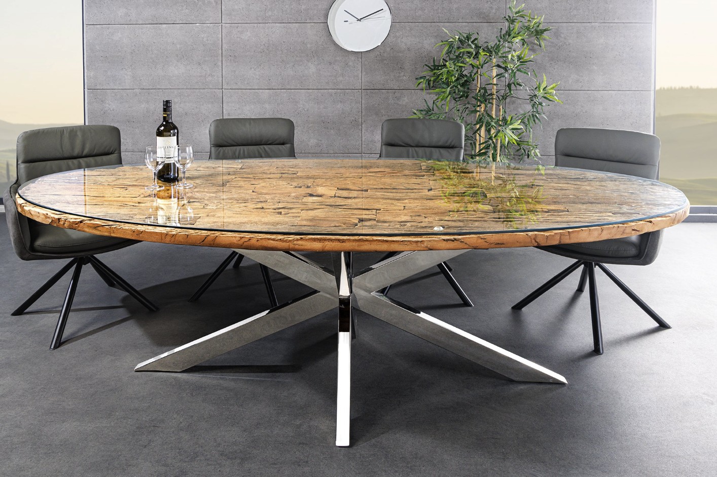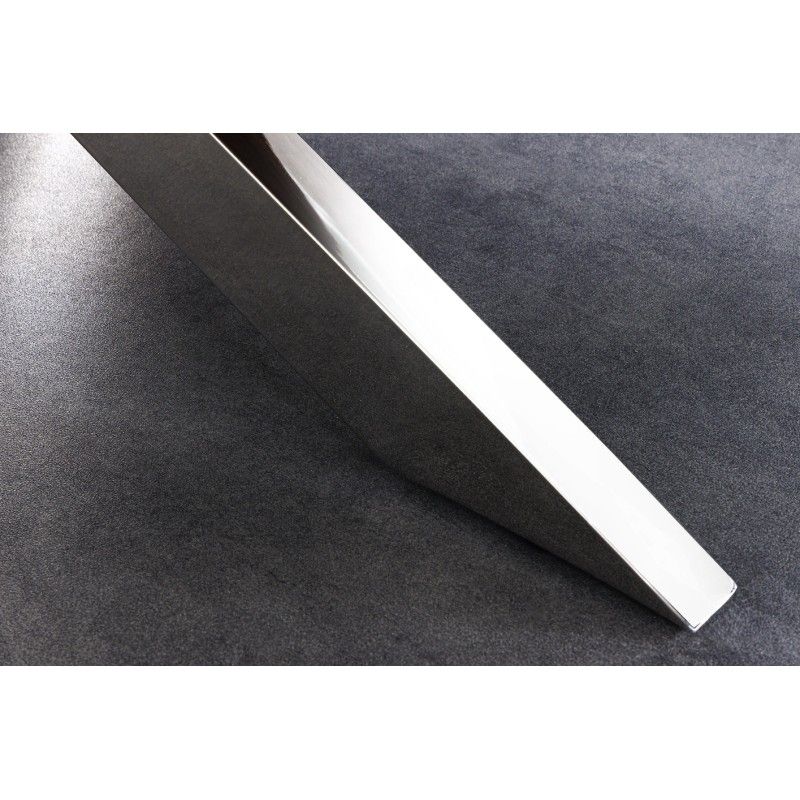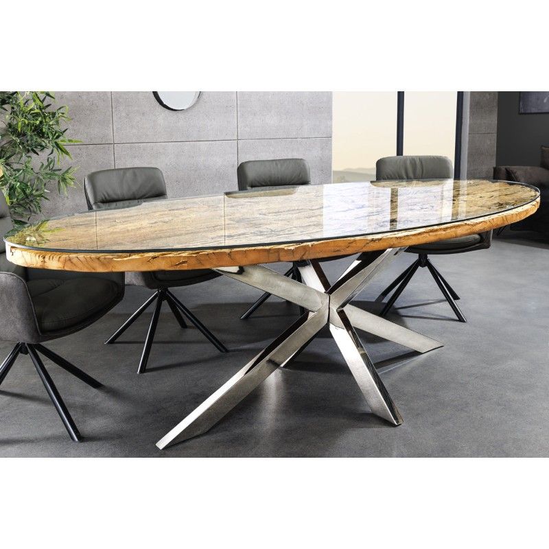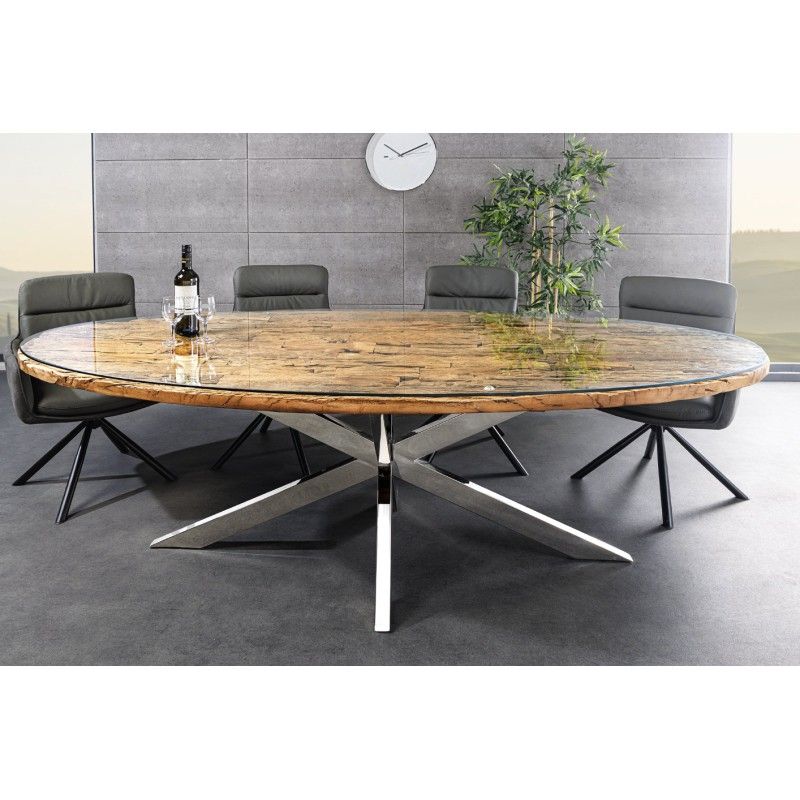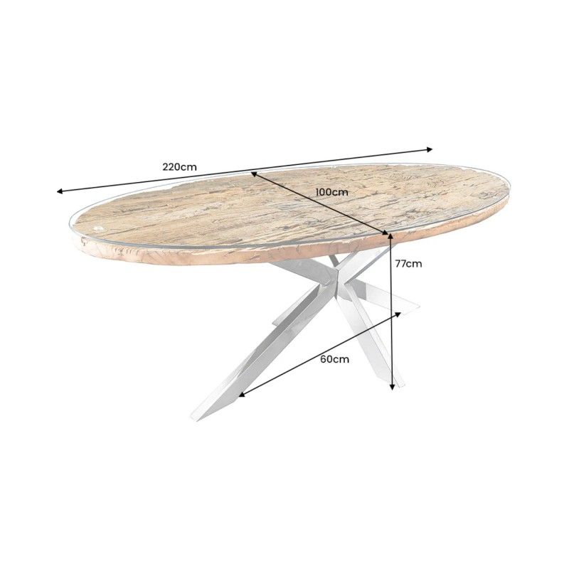 Le plateau combine le bois de teck massif à un verre trempé pour une finition élégante et résistante. L’épaisseur de 40 mm du plateau offre robustesse et présence, tandis que la base en acier chromé assure une excellente stabilité et un style intemporel. Sa forme ovale favorise la convivialité et s’intègre parfaitement dans une salle à manger moderne et design.