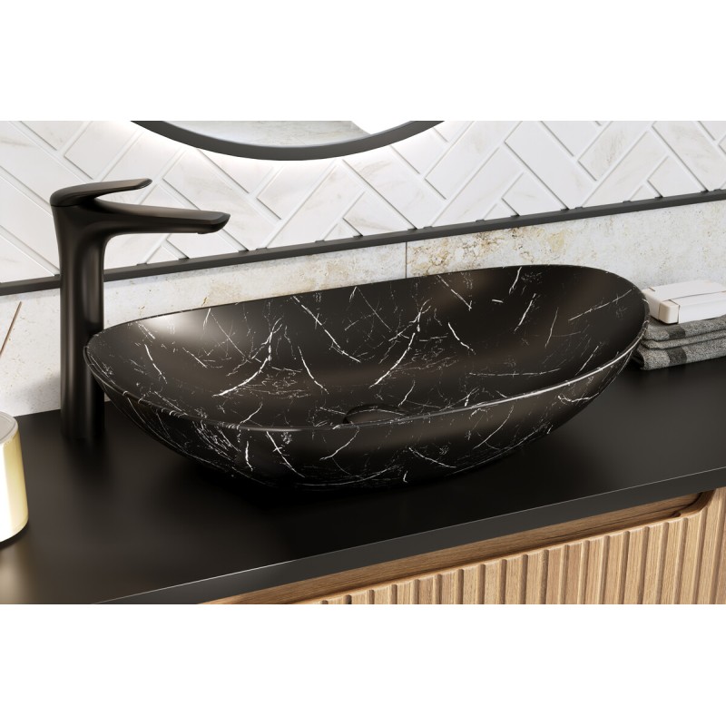 Sa forme ovale allongée aux lignes fluides offre un rendu harmonieux et moderne. Les veinures effet marbre apportent profondeur et raffinement, tandis que la finition mate accentue son aspect haut de gamme tout en limitant les traces visibles au quotidien.