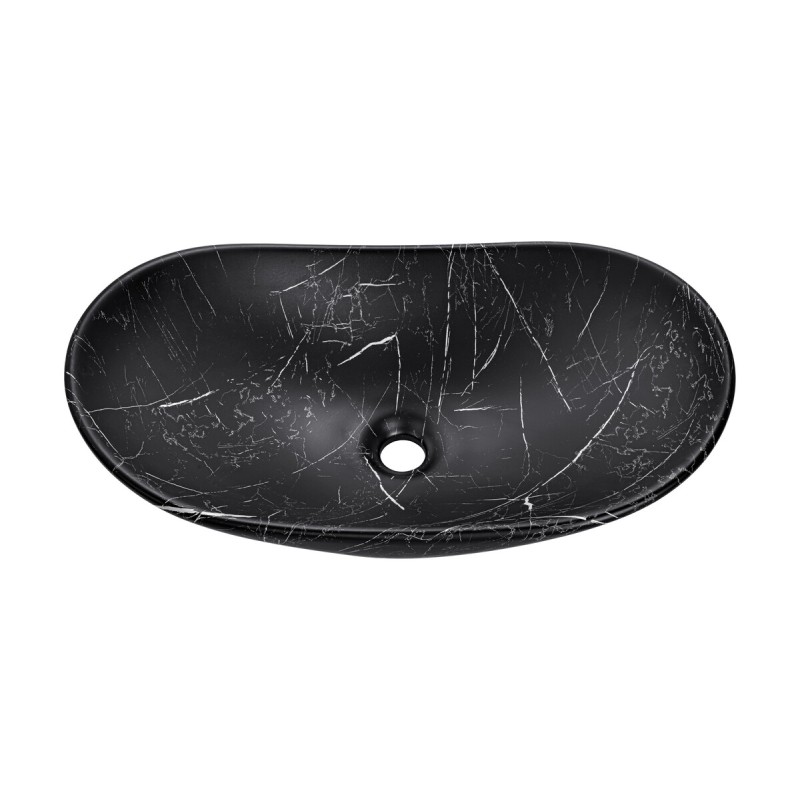 Apportez caractère et élégance à votre salle de bain avec cette vasque à poser ovale 61,5x36 cm noir effet marbre. Son décor marbré subtil sur fond noir crée une ambiance sophistiquée et contemporaine, idéale pour un espace au style affirmé.