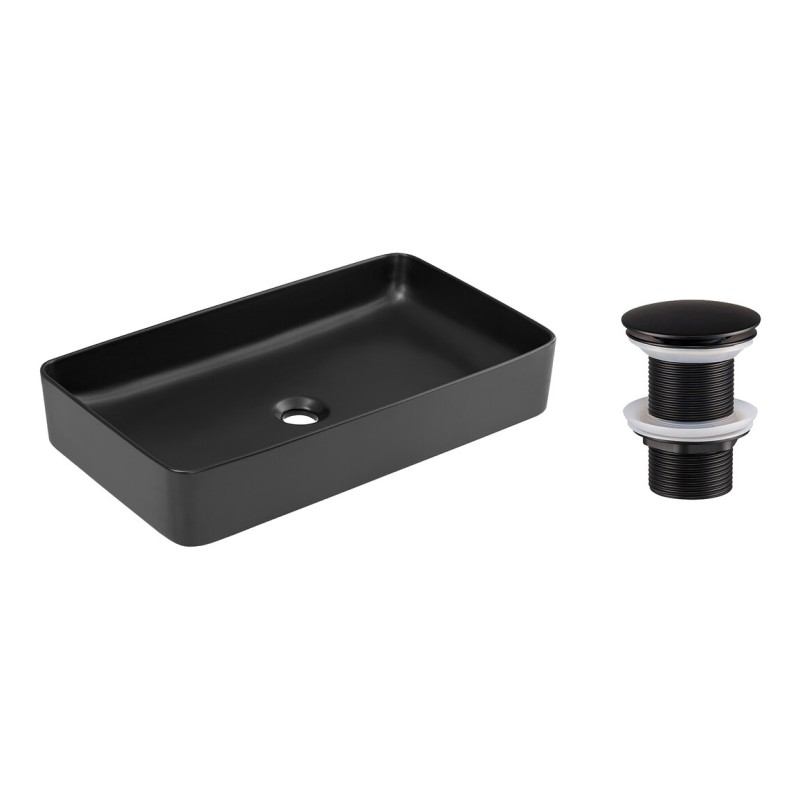 Une bonde de lavabo clic-clac (poussoir) coloris noir est incluse, assurant une harmonie parfaite avec la finition de la vasque et une utilisation simple et pratique. La robinetterie n’est pas incluse afin de vous laisser le choix du mitigeur adapté à votre projet.