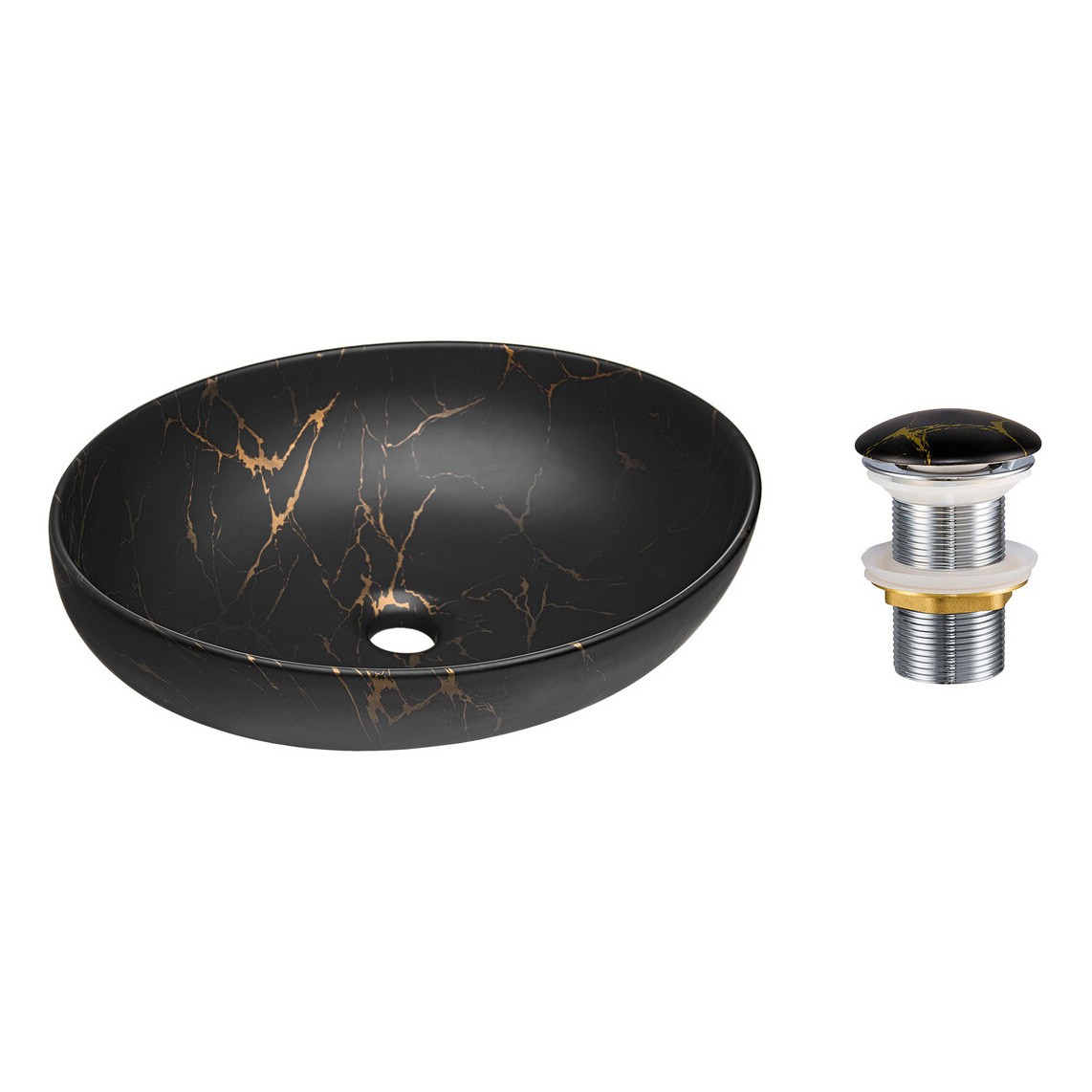 Apportez une touche luxueuse et audacieuse à votre salle de bain avec cette vasque à poser ovale 52x39,5 cm noir et doré effet marbre, livrée avec une bonde de lavabo clic clac (poussoir) assortie pour une finition parfaitement harmonieuse. Son contraste élégant entre le noir profond et les veinures dorées crée un rendu spectaculaire, idéal pour une décoration chic et contemporaine.