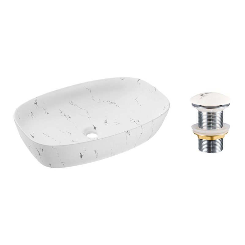 Apportez élégance et modernité à votre salle de bain avec cette vasque à poser ovale 60x30 cm blanc effet marbre, livrée avec une bonde de lavabo clic clac (poussoir) assortie pour une finition parfaitement harmonieuse. Son décor marbré subtil aux veinures délicates offre un rendu raffiné et intemporel, idéal pour créer une ambiance chic et lumineuse.