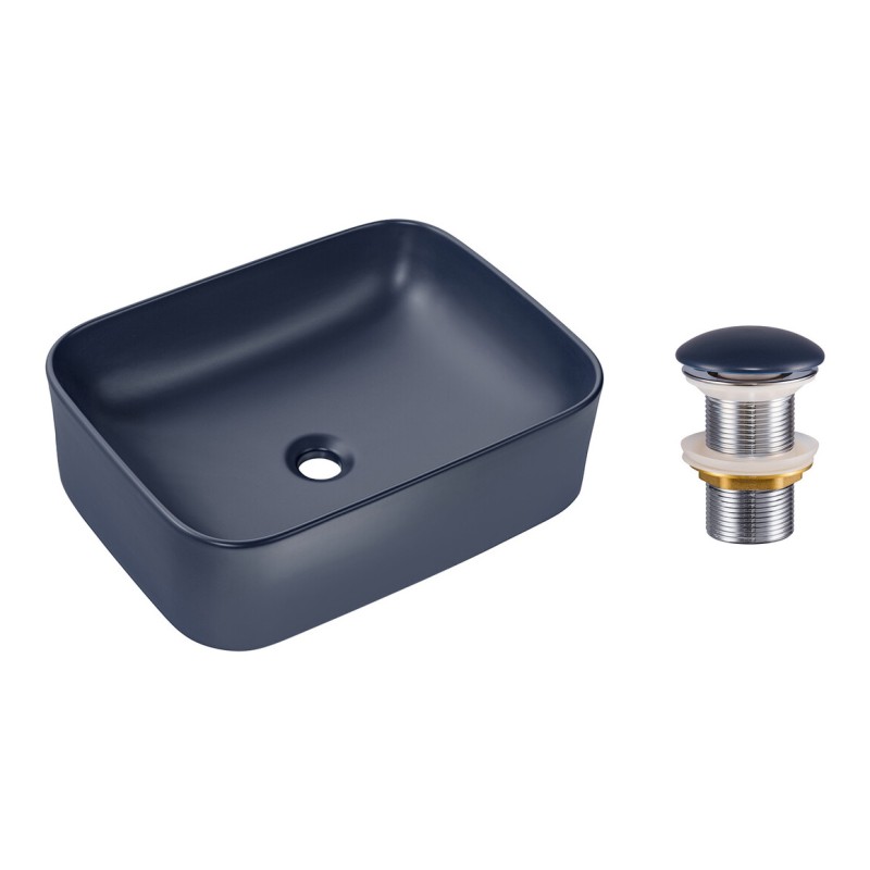 Apportez du caractère à votre salle de bain avec cette vasque à poser rectangulaire 50,5x38 cm en céramique bleu marine mat, livrée avec une bonde de lavabo clic clac (poussoir) assortie pour une finition parfaitement harmonieuse. Son coloris profond et élégant crée une ambiance chic et contemporaine, idéale pour une salle d’eau moderne et sophistiquée.