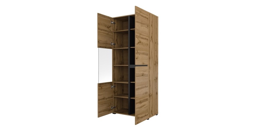 Élevez le style de votre intérieur avec la vitrine HAVANA. Ce meuble de 79,4 cm de largeur et 183,4 cm de hauteur est équipé de 2 portes battantes, dont l'une avec une partie vitrée pour exposer vos plus beaux objets. Elle comprend 10 étagères et 12 niches de rangement, parfaites pour organiser avec style. Le coloris chêne et noir ajoute une touche moderne et chaleureuse à votre espace.