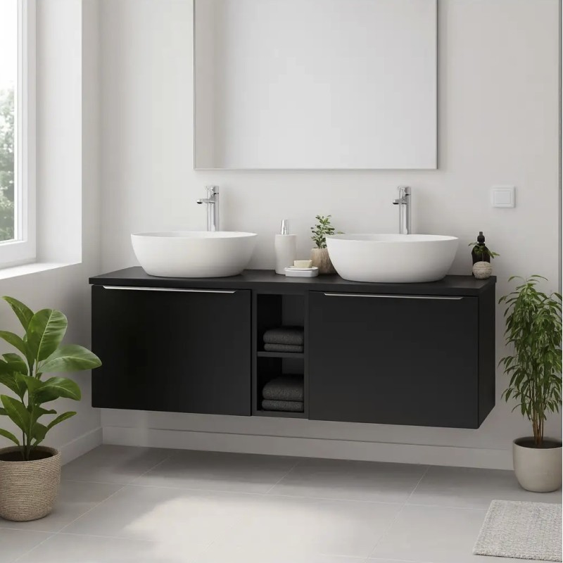 Apportez une touche contemporaine à votre salle de bain avec le plan vasque VANTA 140 cm noir. Sa finition noir mat et son design minimaliste en font un élément élégant et moderne, idéal pour accompagner un meuble sous vasque double ou créer un espace de toilette confortable.